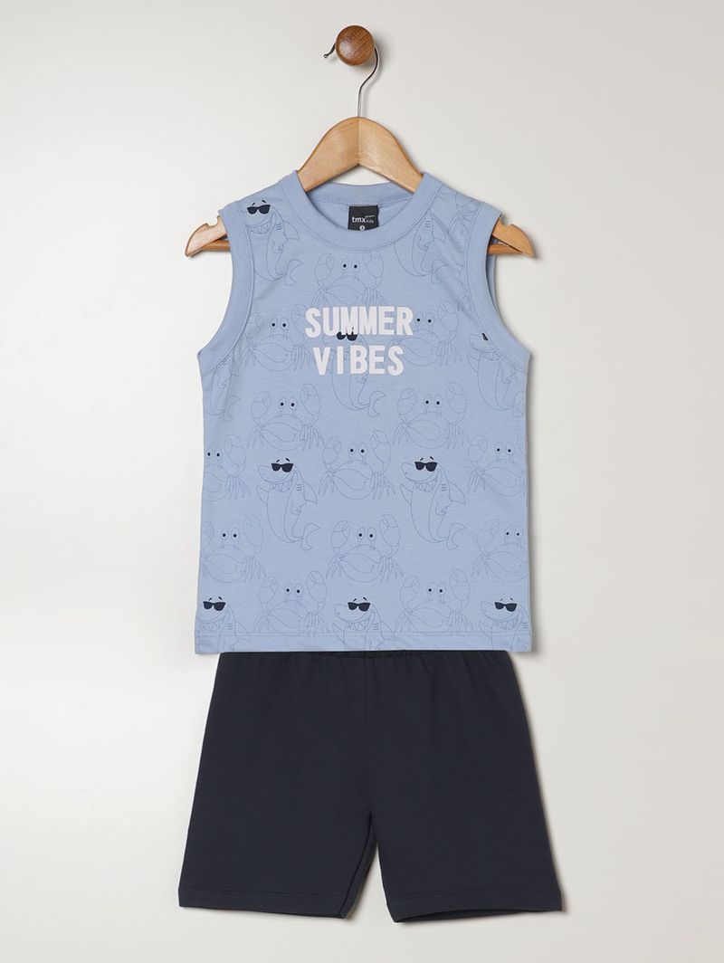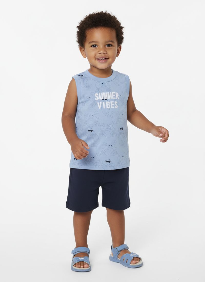 Conjunto infantil para menino composto por duas peças, sendo uma camiseta regata e uma bermuda. A camiseta regata foi desenvolvida em meia malha respirável e com toque macio, possui gola redonda, mangas cavadas e acabamentos simples. Conta com estampa divertida na parte frontal. A bermuda foi desenvolvido em moletinho com linho em sua composição, uma fibra natural e ecológica, conhecida por ser leve, além de contar com uma aparência mais rústica e elegante. Ela possui cós elástico e acabamentos simples. Os conjuntos são super versáteis, pois com eles é possível criar diferentes looks para seu menino, aposte!\n\nTecido Camiseta: Meia Malha\nTecido Bermuda: Moletinho\nComposição Camiseta: 100% algodão\nComposição Bermuda: 67% poliéster, 25% algodão, 08% linho