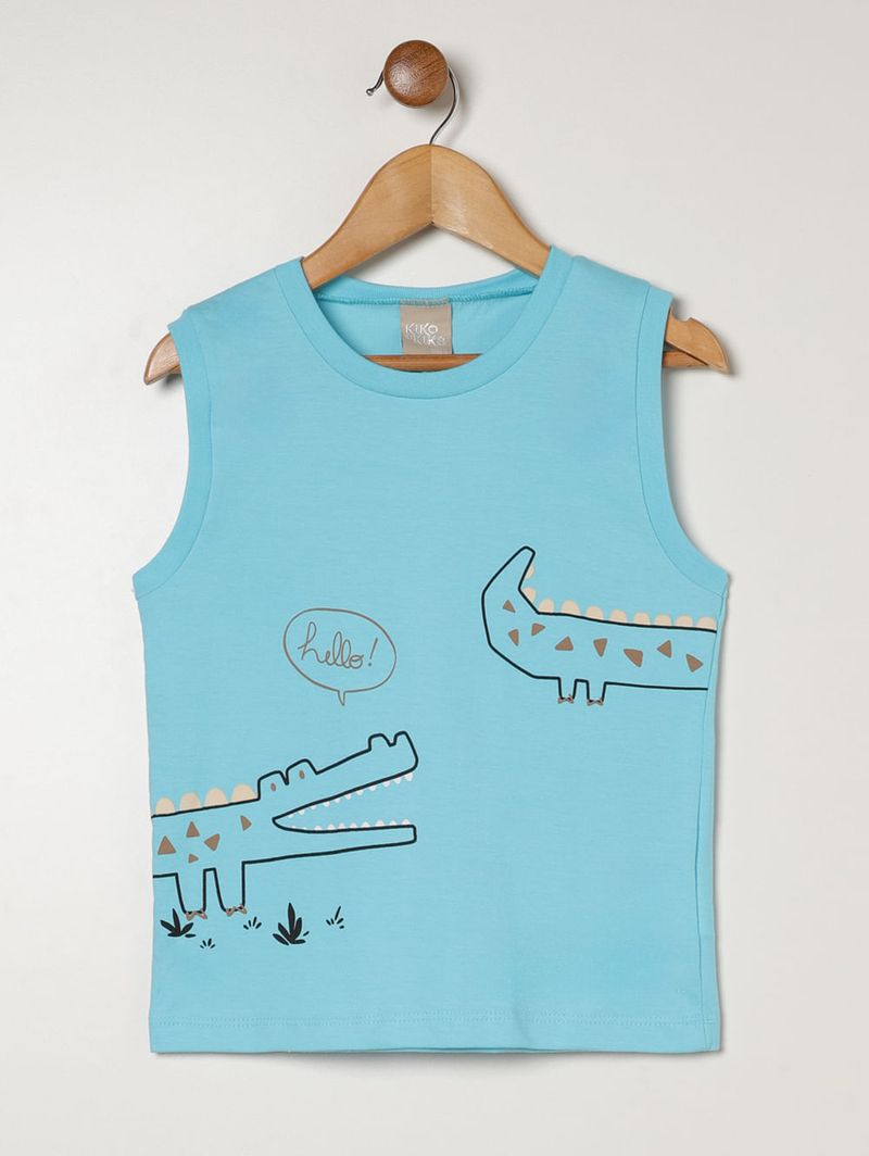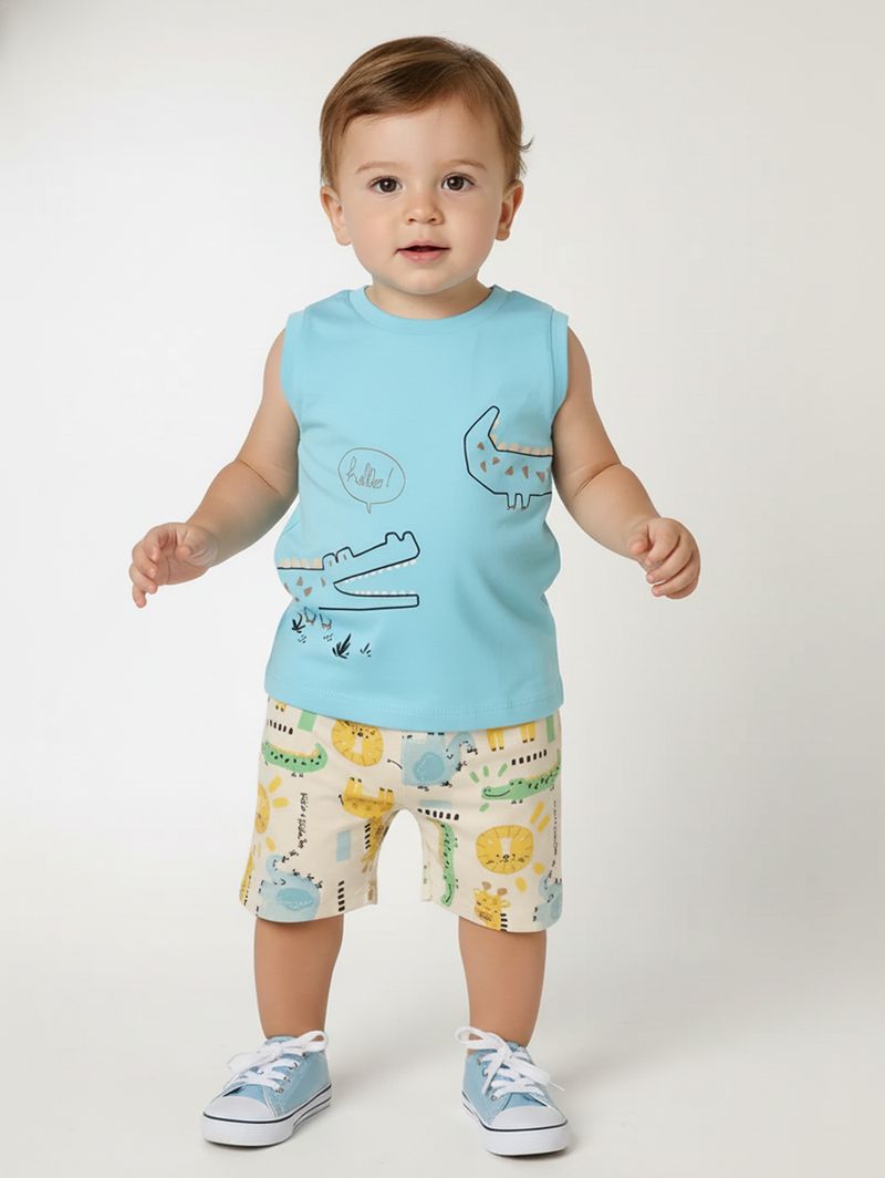 Conjunto curto infantil para menino confeccionado em meia malha e moletinho 100% algodão, garantindo conforto, leveza e liberdade de movimentos. A regata possui gola redonda, mangas cavadas e barra com acabamento simples, ideal para os dias mais quentes. O short apresenta cós elástico e barra com acabamento simples, oferecendo praticidade e ótimo caimento. O diferencial fica por conta da estampa divertida na regata, que adiciona um toque alegre e descontraído ao visual. Perfeito para acompanhar as brincadeiras do dia a dia com muito conforto!\n\nTecido: Regata: Meia malha | Short: Moletinho\nComposição: 100% algodão