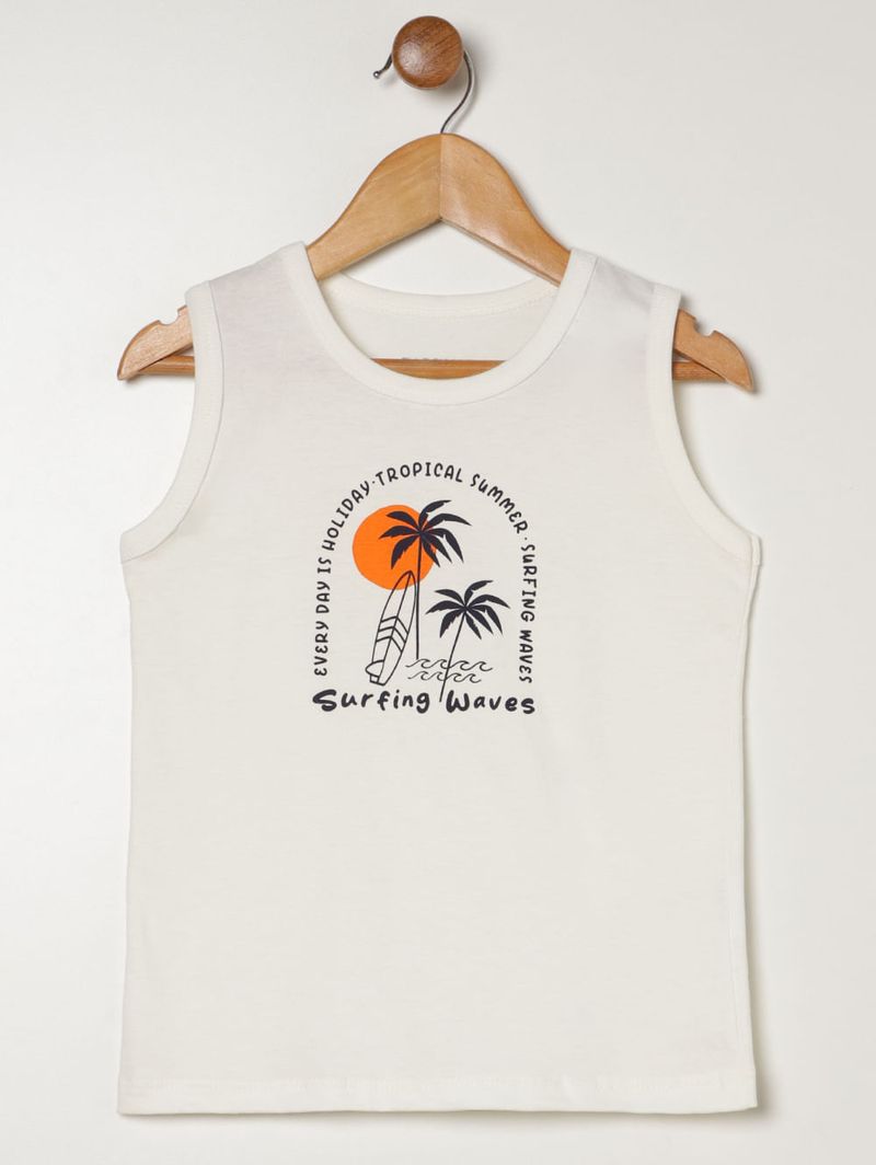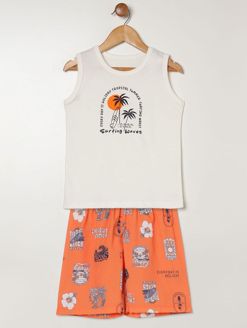 Conjunto infantil para menino confortável e cheio de estilo, composto por camiseta regata em meia malha e bermuda em microfibra. A camiseta possui gola redonda e acabamentos simples, enquanto a bermuda conta com cós elástico que garante ajuste perfeito e caimento leve para maior liberdade de movimento. O destaque fica por conta da estampa tropical, que traz um toque divertido e moderno às produções dos meninos. Aposte, seu menino vai arrasar por onde for!\n\nTecido Camiseta: Meia Malha\nTecido Bermuda: Microfibra\nComposição Camiseta: 100% algodão\nComposição Bermuda: 92% poliéster, 08% elastano