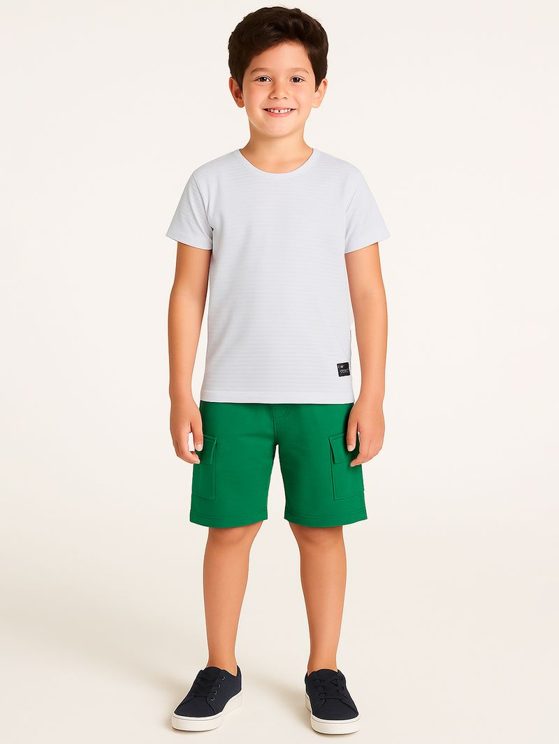 Conjunto infantil para menino composto por camiseta e bermuda. A camiseta é desenvolvida em malha texturizada, um tecido leve e confortável, possui gola redonda com reforço interno que garante maior durabilidade, mangas curtas e barra com acabamento simples. A bermuda é desenvolvida em malha moletinho um tecido semelhante ao moletom, mas sem a felpa. Possui cós elástico, bolsos laterais cargo e barra com acabamento simples. O conjunto que vai transmitir comodidade para os pequenos brincarem!\n\nTecido Camiseta: Malha texturizada\nTecido bermuda: Moletinho\nComposição: 75% algodão, 25% poliéster\nComposição: 100% algodão