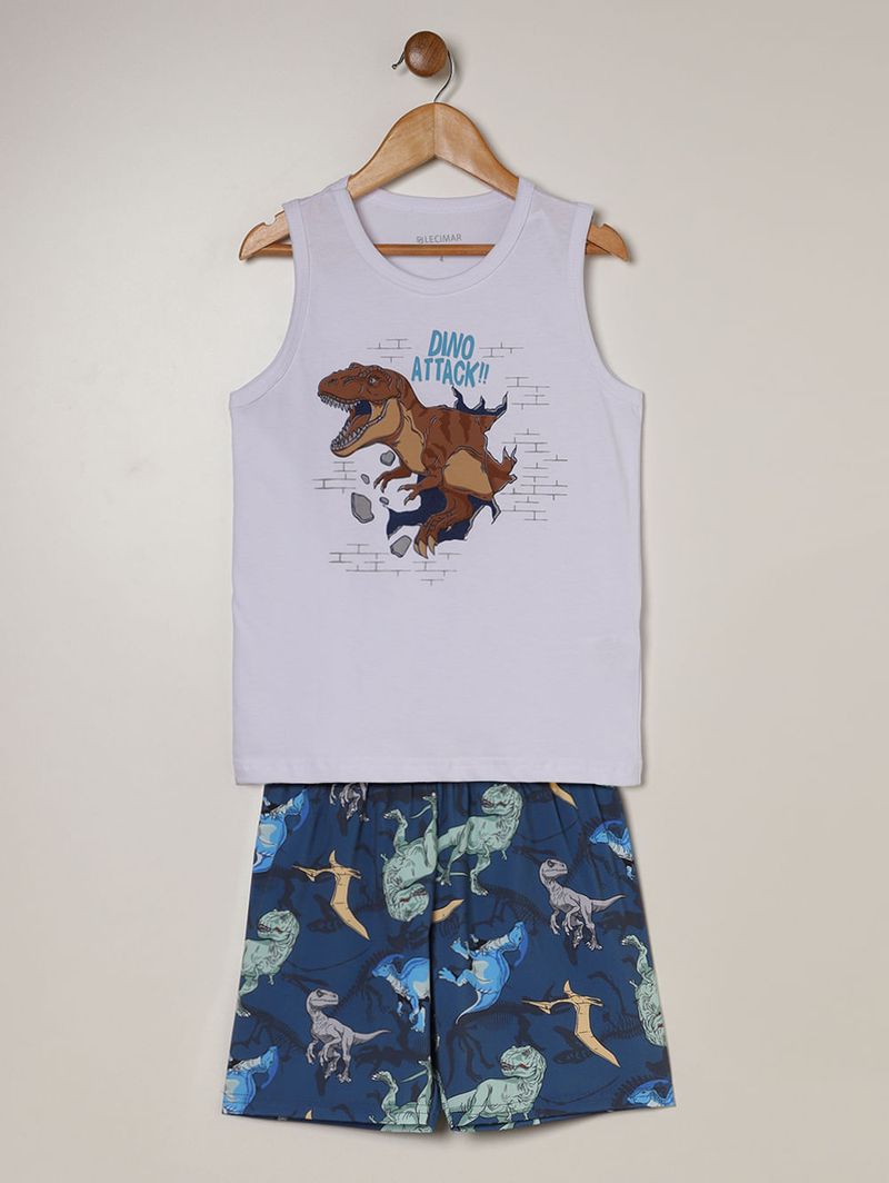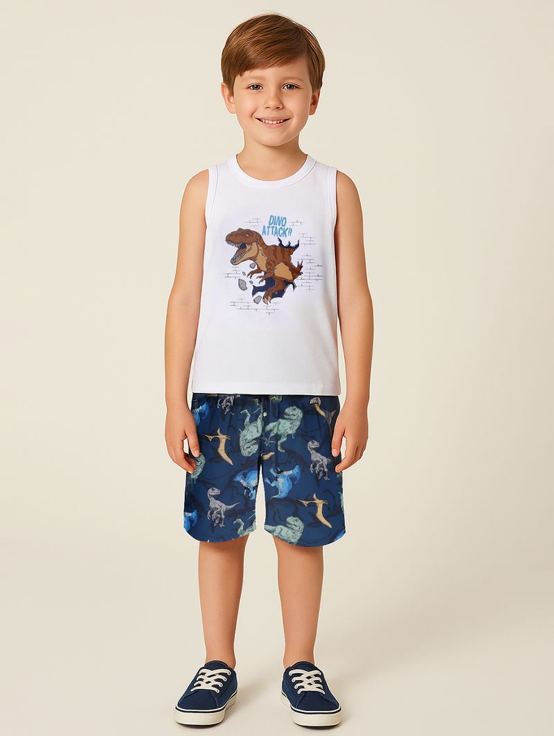 Conjunto infantil para menino composto por regata e bermuda. A regata é desenvolvida em meia malha, um tecido de algodão com toque macio e confortável. Possui gola redonda, mangas cavadas, barra com acabamento simples e diferencial de estampa na parte frontal. A bermuda é desenvolvida em microfibra, um tecido de poliéster e elastano. Apresenta cós elástico, barra com acabamento simples e diferencial de estampa em toda a extensão da peça. O conjunto perfeito para os pequenos viverem grandes momentos!\n\nTecido regata: Meia malha\nTecido bermuda: Microfibra\nComposição: 100% algodão\n\nComposição: 92% poliéster, 08% elastano