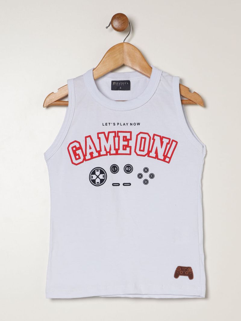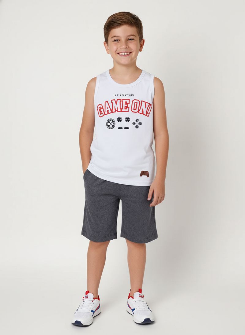Conjunto infantil para menino composto por camiseta regata em meia malha e bermuda em moletinho, combinação que garante conforto, leveza e liberdade de movimento para o dia a dia. A camiseta possui gola redonda, mangas cavadas e acabamentos simples, trazendo praticidade e caimento fresco. Já a bermuda apresenta cós elástico, bolsos frontais funcionais e acabamento simples, ideal para acompanhar as brincadeiras com conforto. O diferencial fica por conta da estampa gamer na camiseta, que adiciona um toque lúdico e moderno ao visual. Um conjunto perfeito para os pequenos explorarem o mundo com estilo e diversão!\n\nTecido Camiseta: Meia Malha\nTecido Bermuda: Moletinho\nComposição Camiseta: 100% algodão\nComposição Bermuda: 65% poliéster, 35% algodão