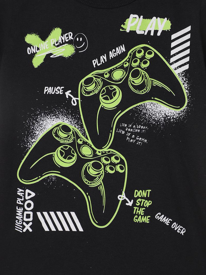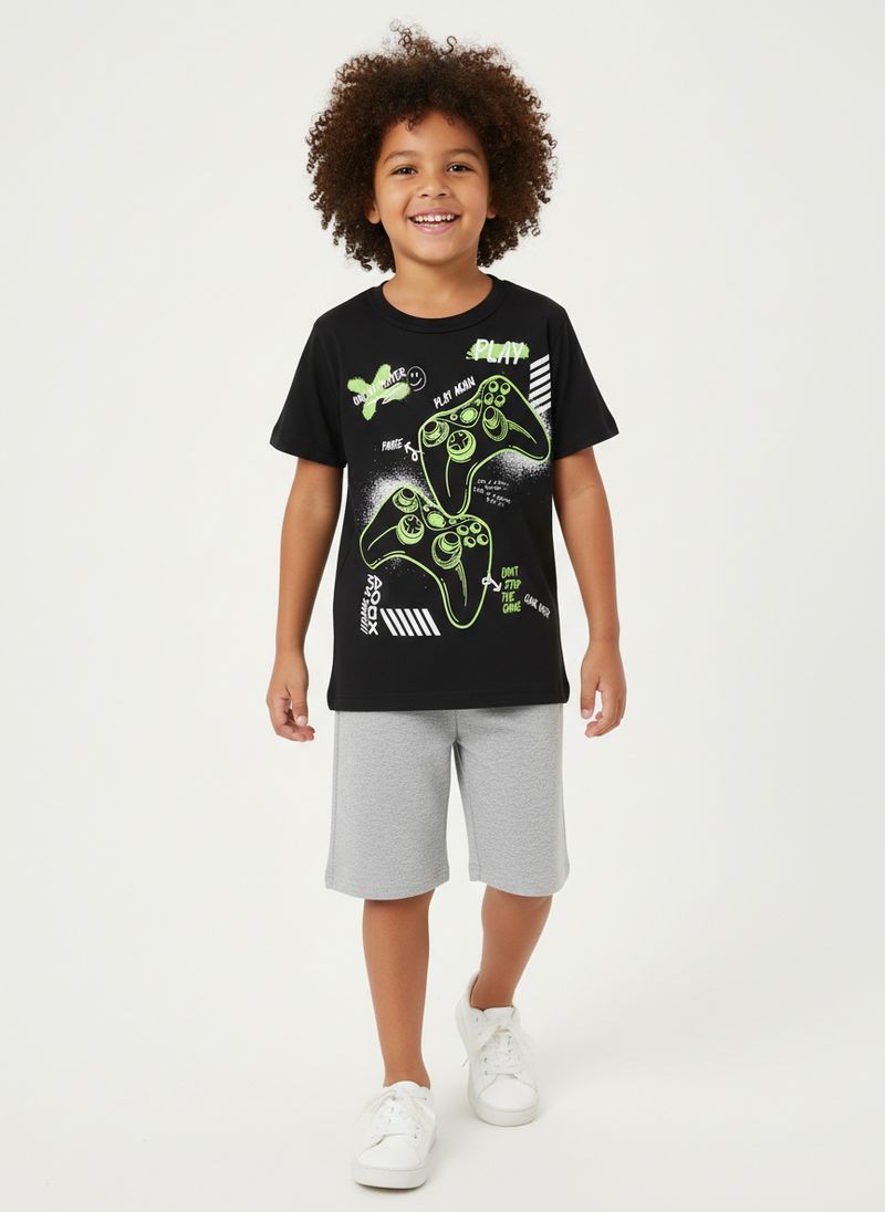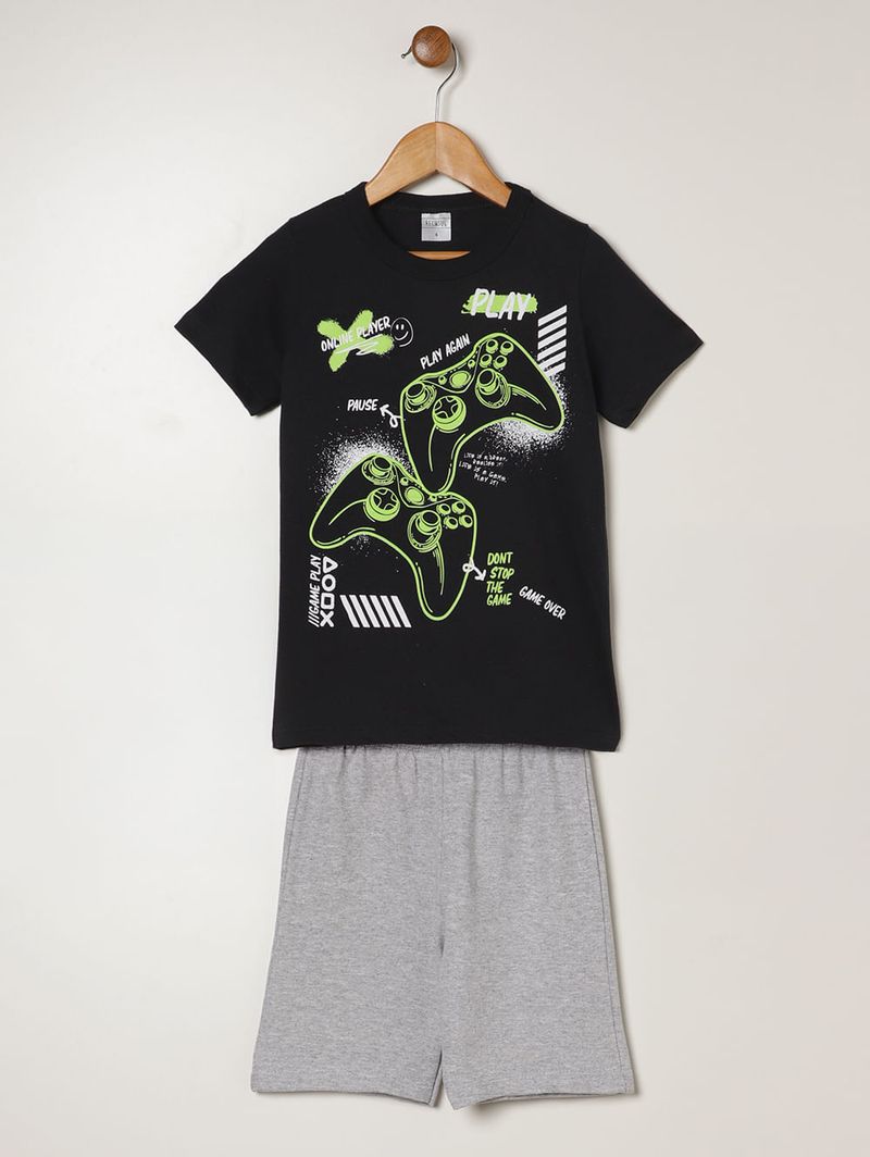 Conjunto infantil para menino composto por duas peças, sendo uma camiseta e uma bermuda. A camiseta desenvolvida em meia malha possui modelagem regular, gola redonda, mangas curtas e acabamentos simples. Conta com estampa frontal despojada e divertida, inspirada no mundo gamer. A bermuda desenvolvida em moletinho possui caimento confortável, cós elástico e acabamentos simples. O conjunto perfeito para acompanhar seu menino em todas as aventuras!\n\nTecido Camiseta: Meia Malha\nTecido Bermuda: Moletinho\nComposição Camiseta: 100% algodão
