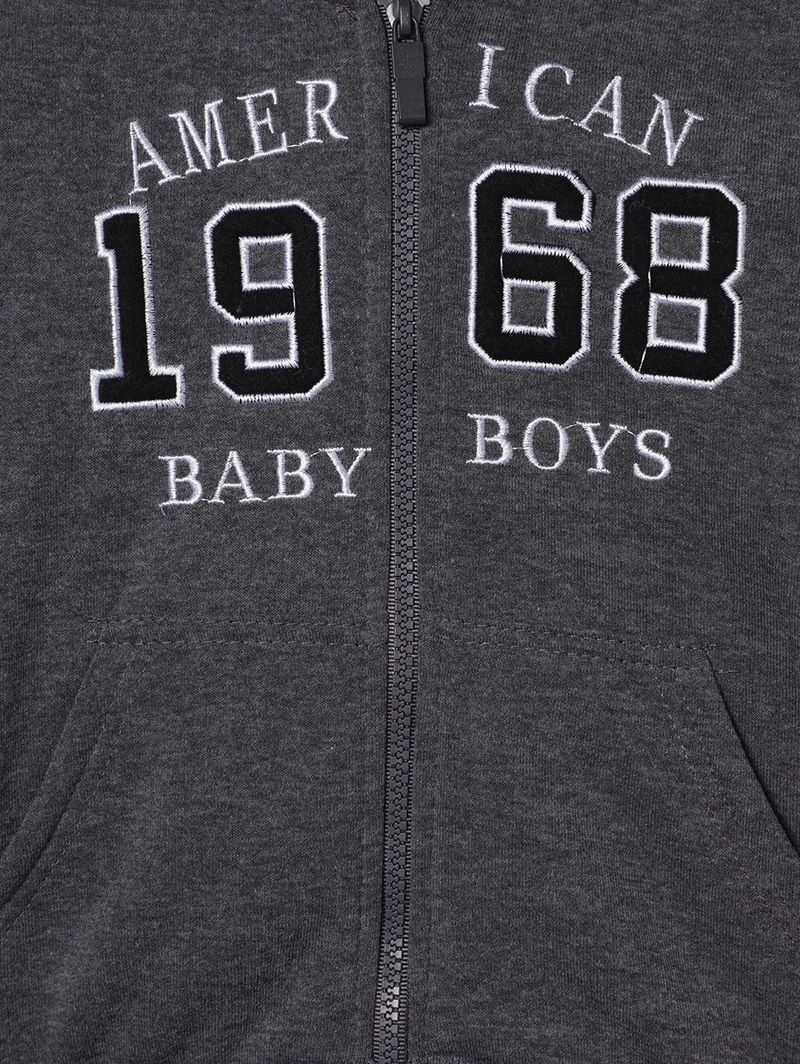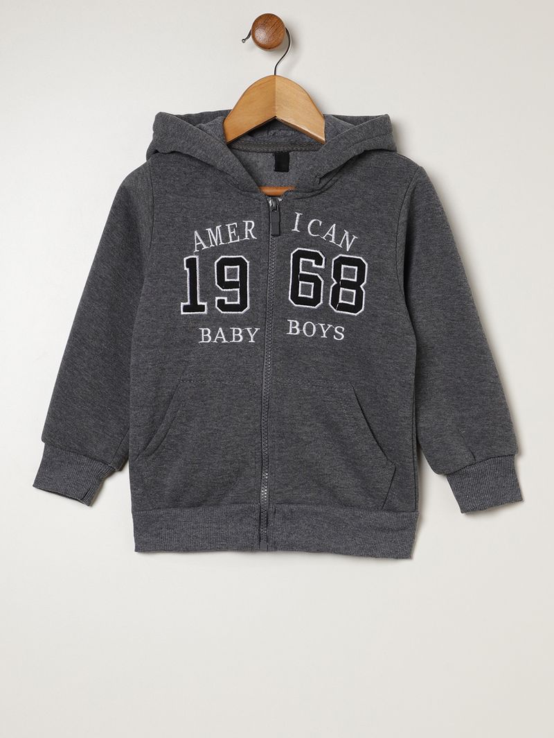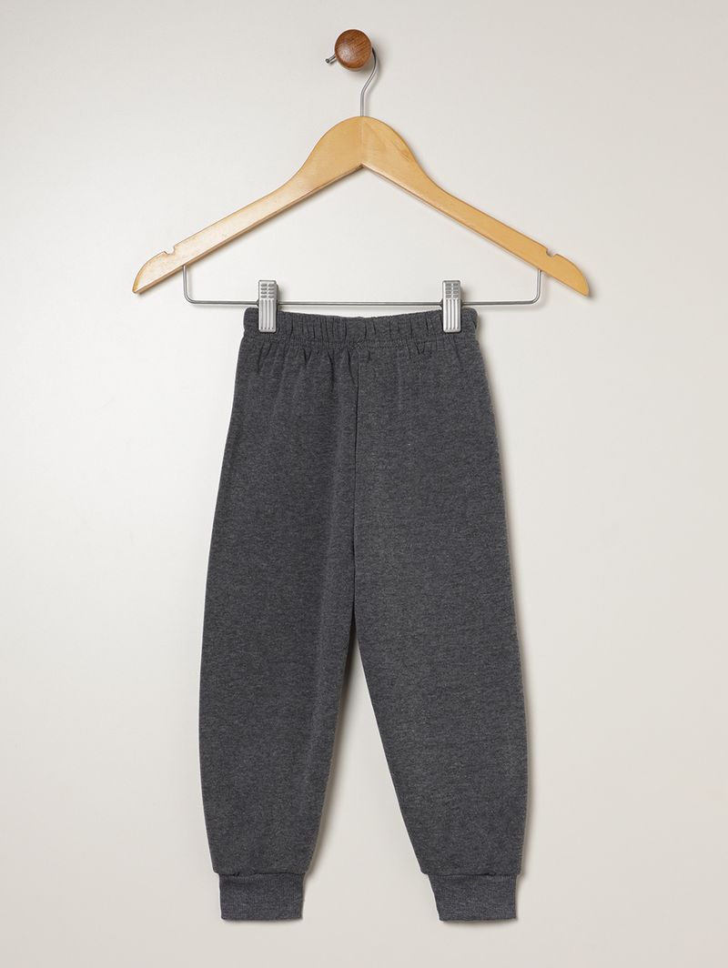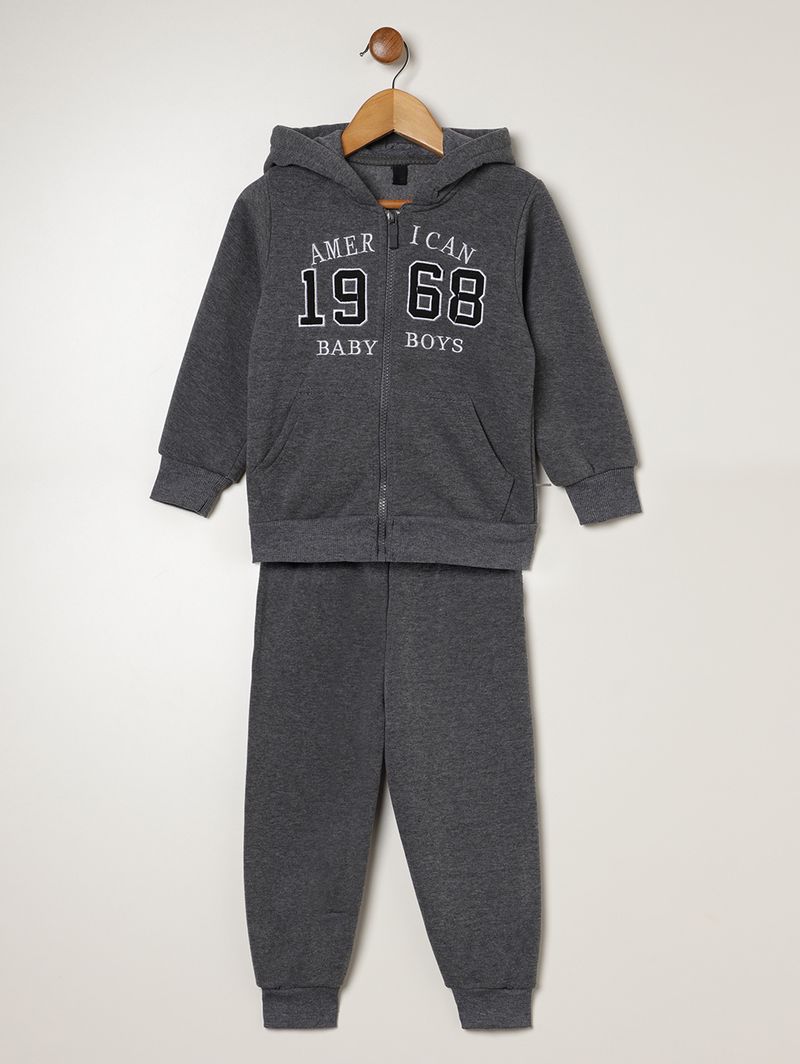Conjunto infantil para menino composto por jaqueta e uma calça, ambos desenvolvidos em moletom com parte interna flanelada que confere maior conforto físico e térmico. A jaqueta possui capuz com reforço interno para maior durabilidade, mangas compridas com punho, fechamento frontal por zíper, bolsos frontais funcionais, além de diferencial de bordados com escritas na parte frontal. A calça apresenta modelagem jogger, cós elástico e barra com acabamento em punho. O conjunto perfeito para acompanhar o seu pequeno com muita comodidade!\n\nTecido: Moletom\nComposição: 100% poliéster