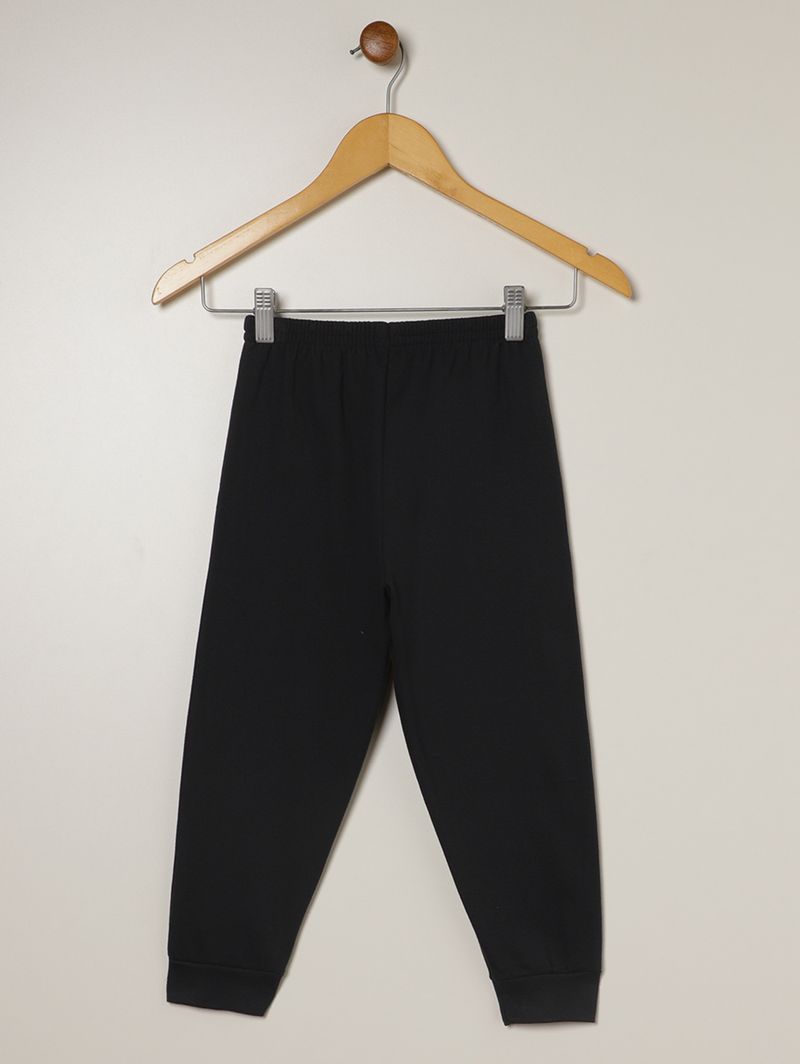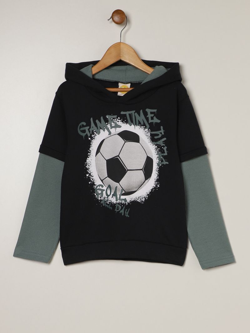 Conjunto infantil para menino composto por duas peças, sendo um blusão e uma calça, ambas desenvolvidas em moletom com parte interna flanelada, oferecendo conforto e aquecimento para os dias mais frios. O blusão possui capuz, mangas longas em malha texturizada de tom contrastante e acabamentos simples. Conta ainda com estampa esportiva na parte frontal, trazendo um toque lúdico e divertido à peça. A calça possui cós elástico e acabamento em punho na barra, além de contar com caimento confortável. A escolha perfeita para garantir um look despojado e cheio de personalidade para seu menino!\n\nTecido: Moletom\nComposição: 100% algodão\nComposição Mangas e Forro do Capuz: 50% poliéster, 50% algodão