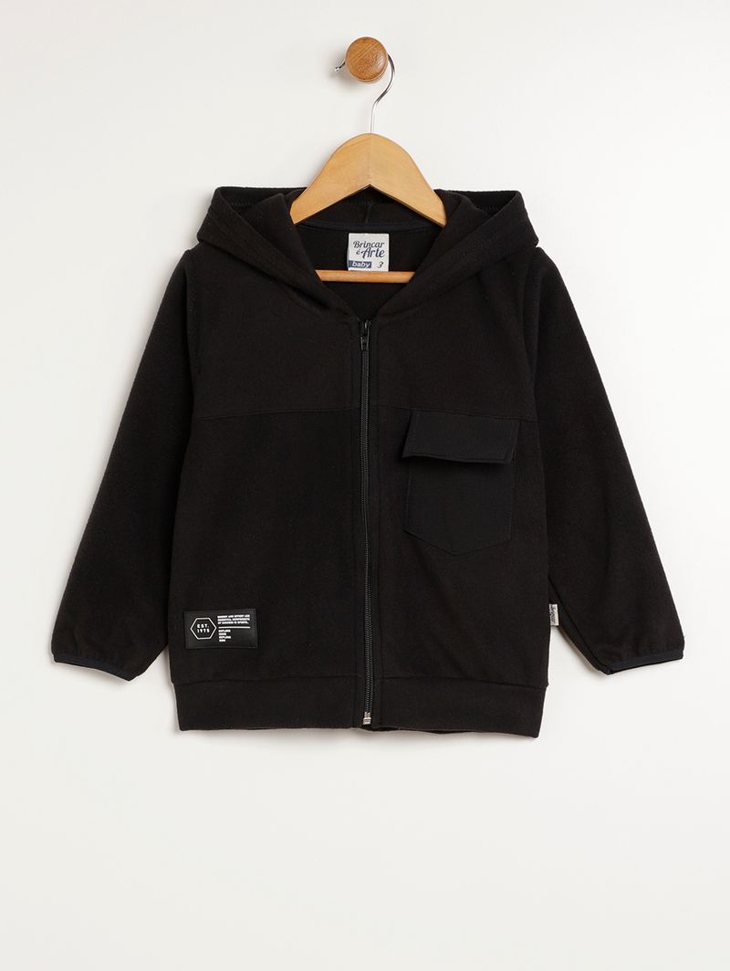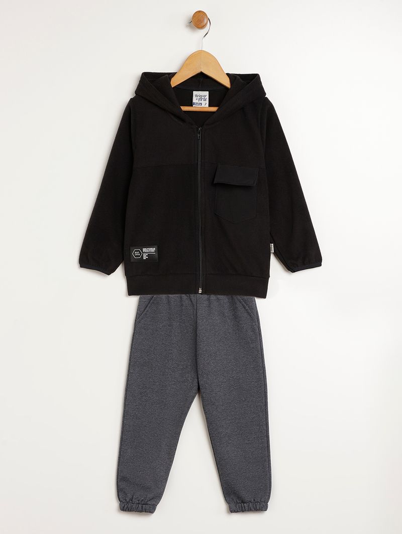 Conjunto infantil para menino composto por duas peças, uma jaqueta e uma calça. A jaqueta é desenvolvida em microsoft, um tecido macio e super confortável, o modelo apresenta capuz com reforço interno que garante mais durabilidade, mangas compridas com elástico, bolso frontal na altura do peito e barra com acabamento simples. A calça é desenvolvida em moletom com parte interna flanelada que garante mais conforto, possui modelagem jogger, cós elástico, bolsos frontais decorativos e barra com acabamento em punho elástico. O melhor para o seu pequeno aproveitar com comodidade!\n\nTecido Jaqueta: Microsoft\nTecido Calça: Moletom\nComposição: 96% poliéster, 04% elastano\nComposição: 50% algodão, 50% poliéster