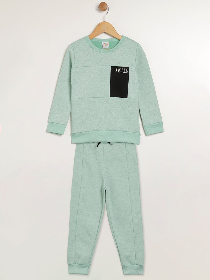 Conjunto infantil para menino composto por duas peças, sendo um blusão e uma calça, ambos desenvolvidos em moletom com parte interna flanelada e linho em sua composição. O blusão possui gola redonda, mangas longas com punho e acabamentos simples. Conta com recorte em tom contrastante na altura do peito. A calça apresenta modelagem jogger, cós elástico com cordão decorativo e barra com acabamento em punho. Conta com costuras centrais que modernizam a peça. Estilo e conforto para os pequenos aventureiros!\n\nTecido: Moletom\nComposição: 53% algodão, 40% poliéster, 07% linho