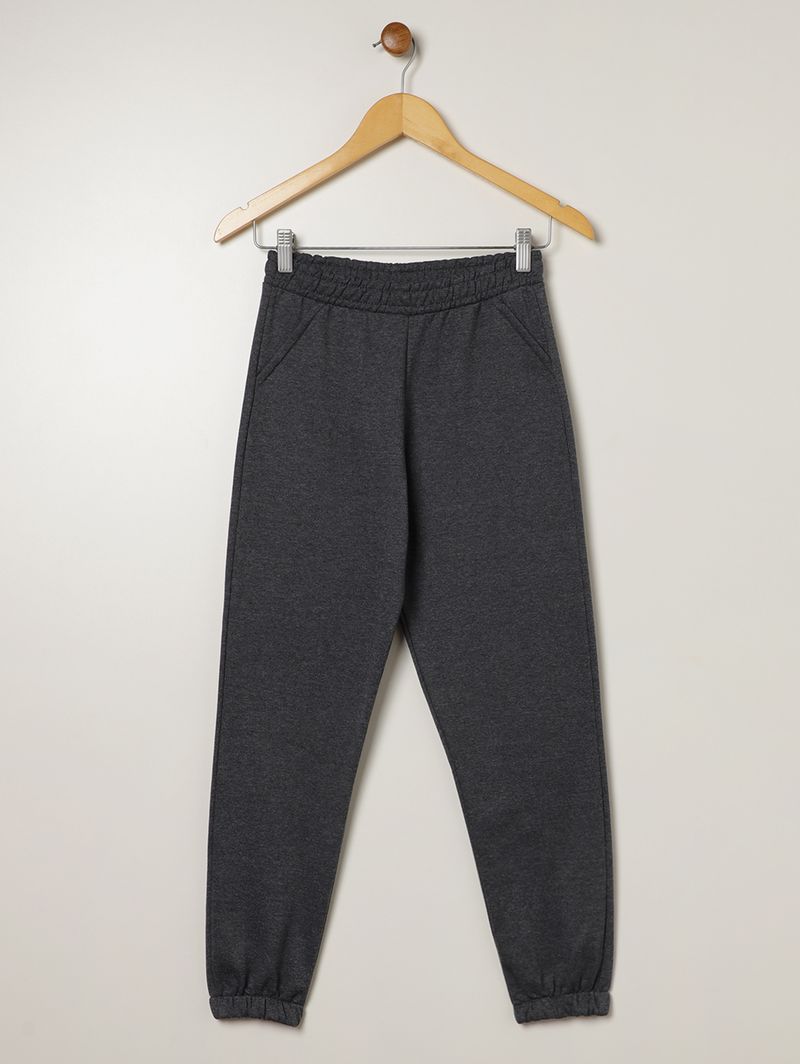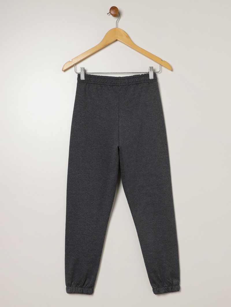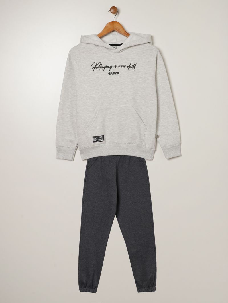 Conjunto juvenil para menino composto por duas peças, sendo um blusão e uma calça, ambos desenvolvidos em moletom com parte interna flanelada, proporcionando conforto e aconchego nos dias mais frios. O blusão possui capuz, mangas longas com punho, acabamentos canelados e bolso canguru. Conta com estampa de frase em relevo na parte frontal. A calça apresenta cós elástico e barra com acabamento em punho. Possui bolso decorativo na parte frontal. Aposte em conforto para os looks do seu menino!\n\nTecido: Moletom\nComposição: 50% algodão, 50% poliéster