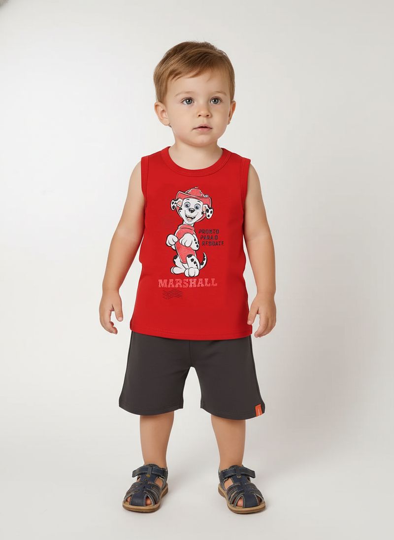 Conjunto infantil para menino confeccionado em tecidos leves e confortáveis, ideal para os momentos de diversão do dia a dia. A regata em meia malha 100% algodão possui gola redonda, mangas cavadas, barra com acabamento simples e o diferencial da estampa divertida da Patrulha Canina, que traz um toque lúdico e cheio de personalidade. A bermuda em moletinho conta com cós elástico e barra com acabamento simples, garantindo praticidade e conforto. Um conjunto fofo e descontraído, perfeito para looks casuais e confortáveis!\n\nTecido regata: Meia malha\nTecido bermuda: Moletinho\nComposição: 100% algodão