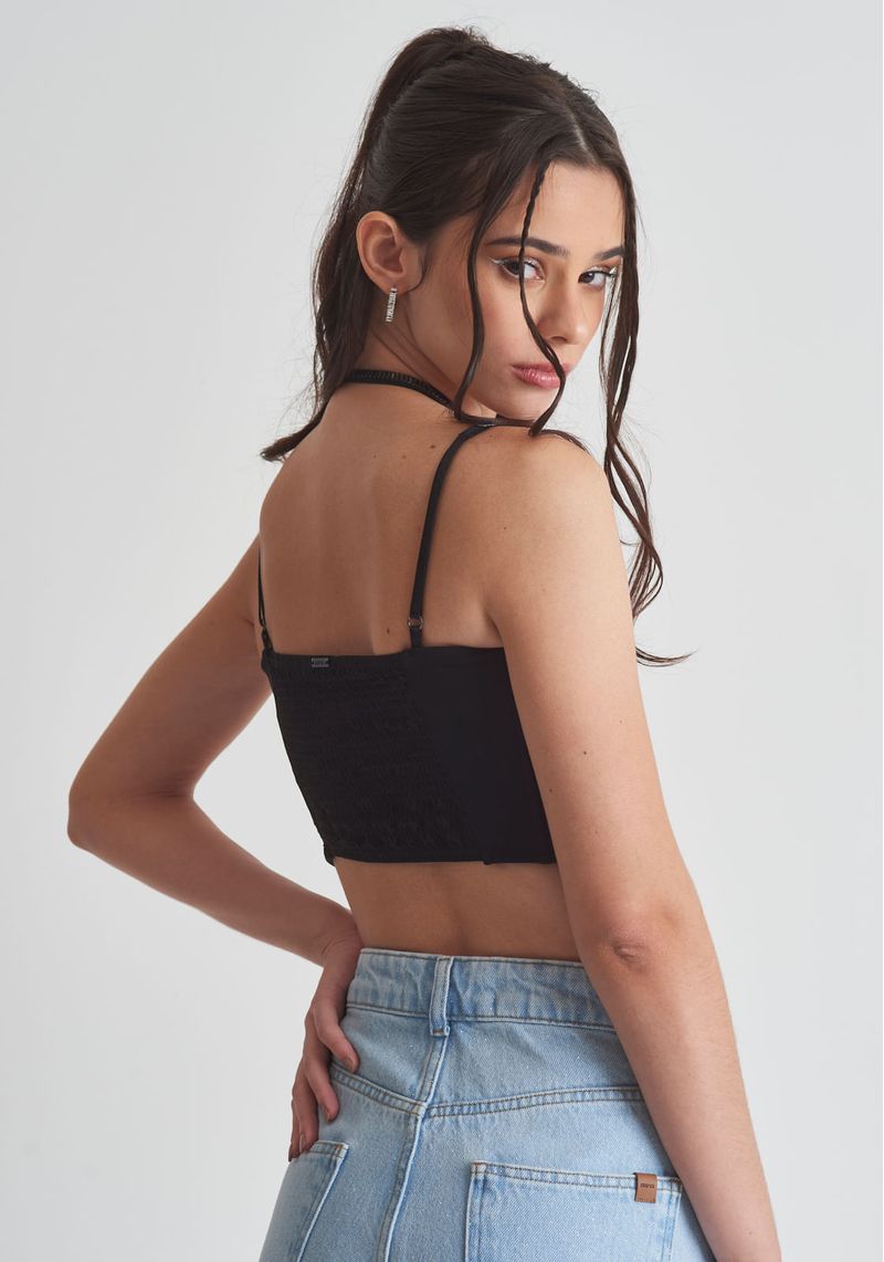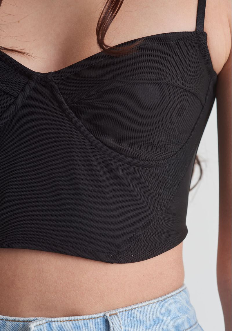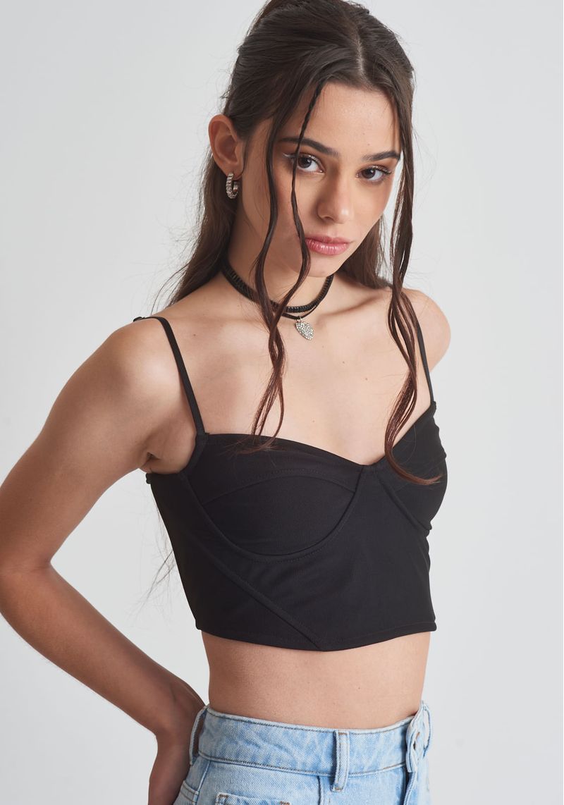 O corset de tule preto com barbatana é uma peça ousada e cheia de estilo, perfeita para criar looks que misturam elegância e sensualidade. O tule traz um toque delicado, enquanto as barbatanas ajudam a modelar a silhueta, proporcionando um caimento estruturado. Barbatanas localizadas na diagonal da peça. modelo veste: bottom 38 | top P altura: 1,70cm | busto: 76cm | cintura: 62cm | quadril: 88cm