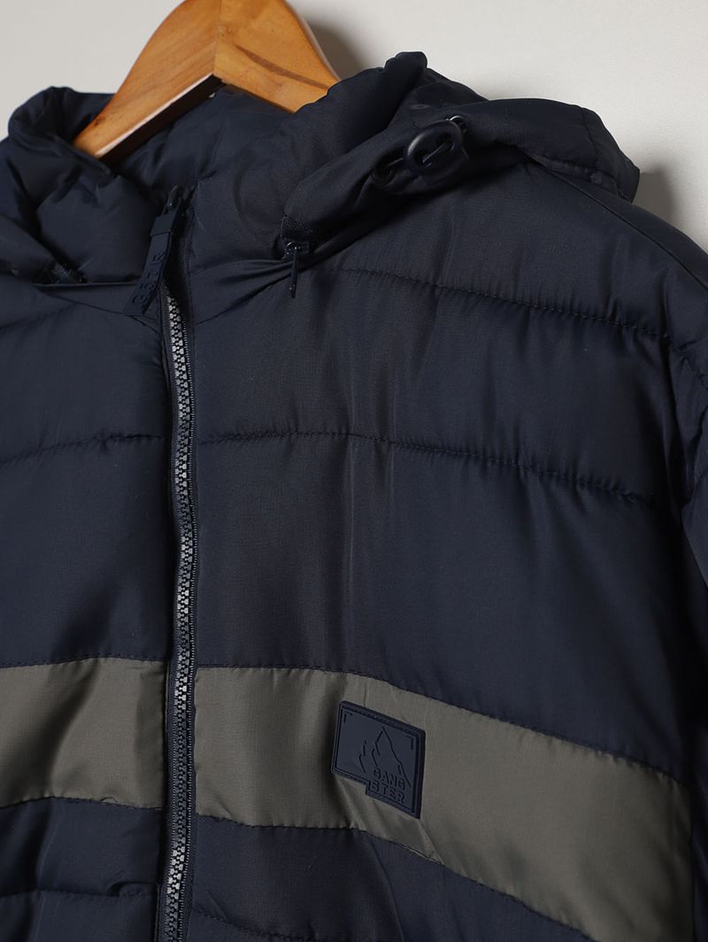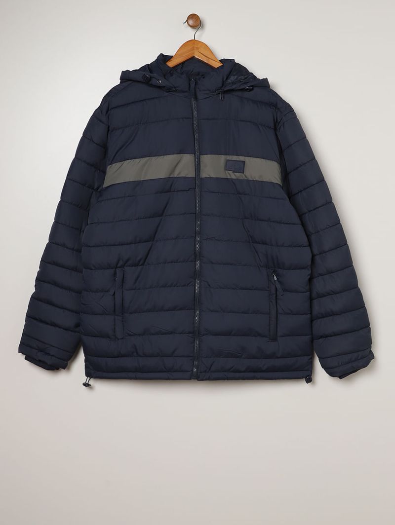 Jaqueta masculina desenvolvida em tecido plano de toque leve e estrutura firme, oferecendo resistência ao uso diário e um ótimo caimento. O modelo puffer se destaca pelo visual acolchoado com pespontos pela sua extensão, adicionando estilo e reforçando a proteção térmica. Apresenta capuz removível por zíper e ajustável por puxador elástico, mangas longas com punho, fechamento frontal por zíper e acabamentos elásticos. Como destaque, possui recorte frontal em tom contrastante que valoriza o seu visual. Conta com dois bolsos frontais funcionais com fechamento por zíper, ideal para você guardar seus objetos com segurança. Essa jaqueta é aquele essencial que eleva qualquer look de inverno!\n\nTecido: Plano\nComposição: 100% poliéster