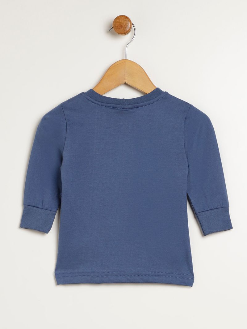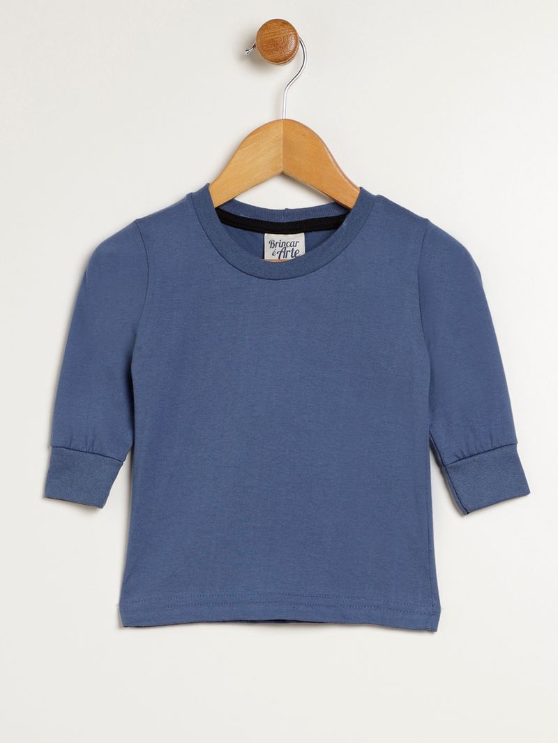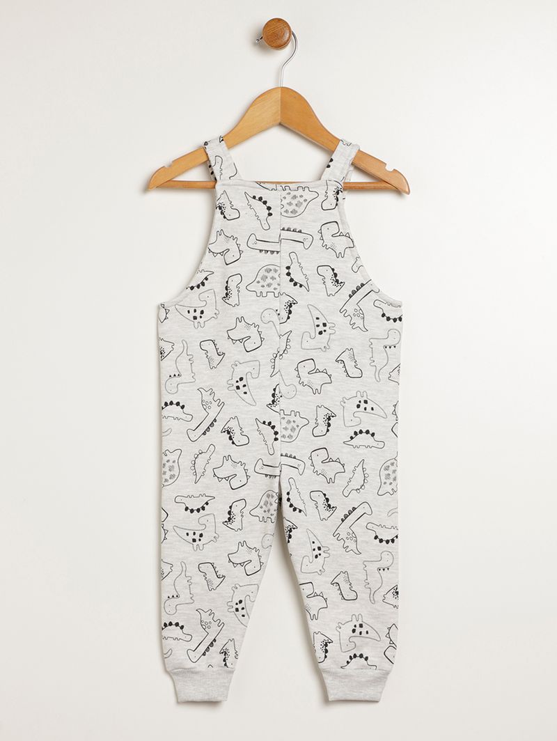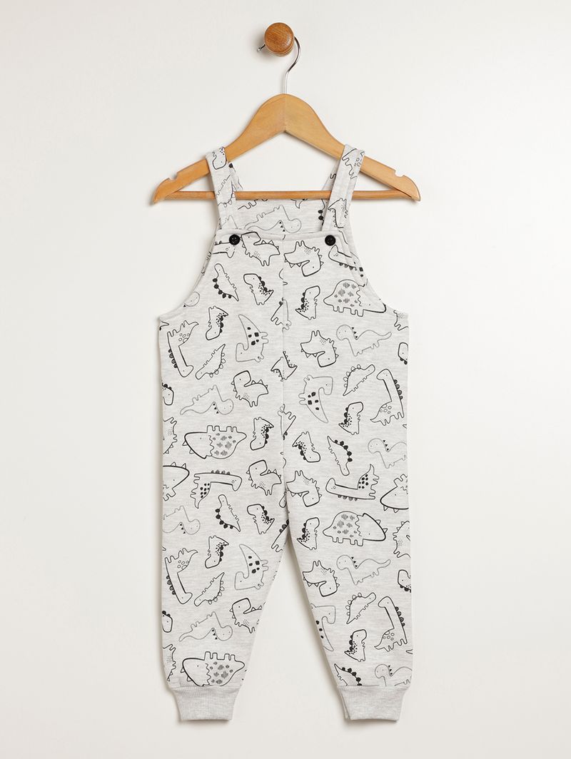 Conjunto infantil para bebê composto por duas peças, uma jardineira e uma camiseta. A camiseta é desenvolvida em meia malha, um tecido de algodão super confortável, possui gola redonda com reforço interno, mangas compridas com punho e barra com acabamento simples. A jardineira possui decote quadrado, alças finas com abotoamento e barra com acabamento em punho. O diferencial da jardineira fica por conta da estampa de dinossauros em toda a extensão da peça que a deixa mais divertida. O conjunto perfeito para os pequenos aproveitarem com diversão!\n\nTecido camiseta: Meia malha\nTecido jardineira: Moletom\nComposição: 100% algodão\nComposição: 75% algodão, 25% poliéster