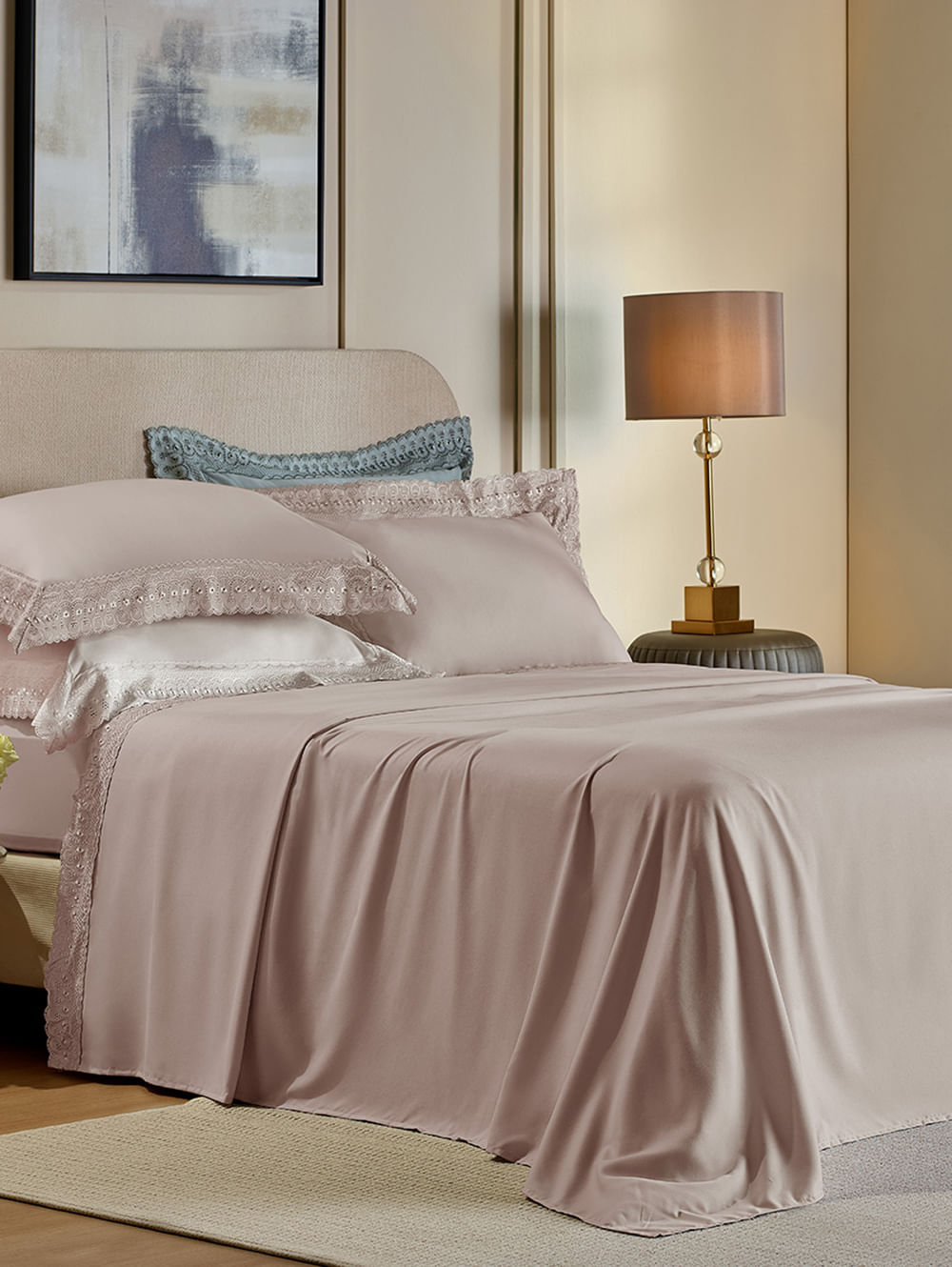 Jogo de lençol duplo para cama queen desenvolvido em tecido plano de poliéster com toque acetinado que proporciona uma sensação suave e acolhedora. O kit é composto por 04 peças, sendo 01 sobre lençol, 01 lençol com elástico que permite um melhor ajuste no colchão e 02 fronhas. Seu design moderno ganha destaque com a renda de bordado inglês, um detalhe que adiciona charme e delicadeza à peça. Aposte e garanta uma cama arrumada com charme e elegância!