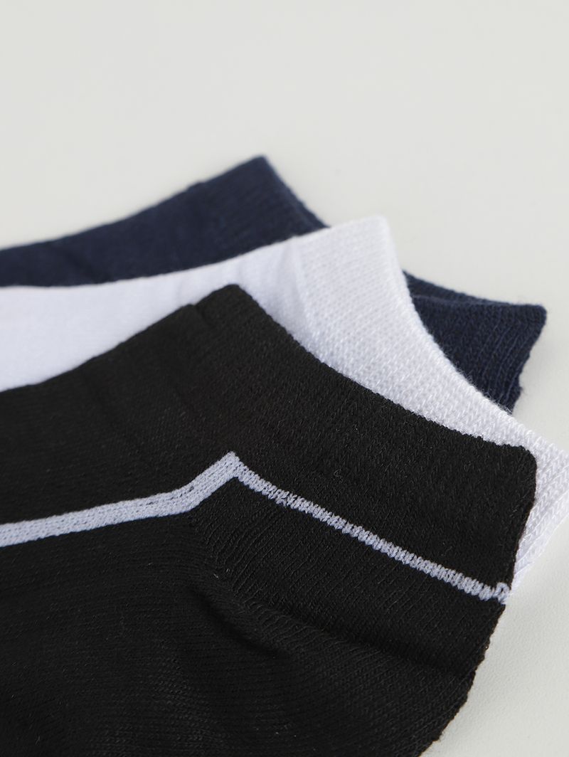 Kit de meias masculinas com 03 pares desenvolvidos em poliéster, algodão e elastano. Os modelos apresentam cano curto e calcanhar verdadeiro. O seu diferencial fica por conta de detalhes em tom contrastante. A peça que vai garantir mais conforto para os seus pés no dia a dia!\n\nContém: 03 pares de meias\nComposição: 62% poliéster, 35% algodão, 03% spandex\nTamanho: 40 - 46