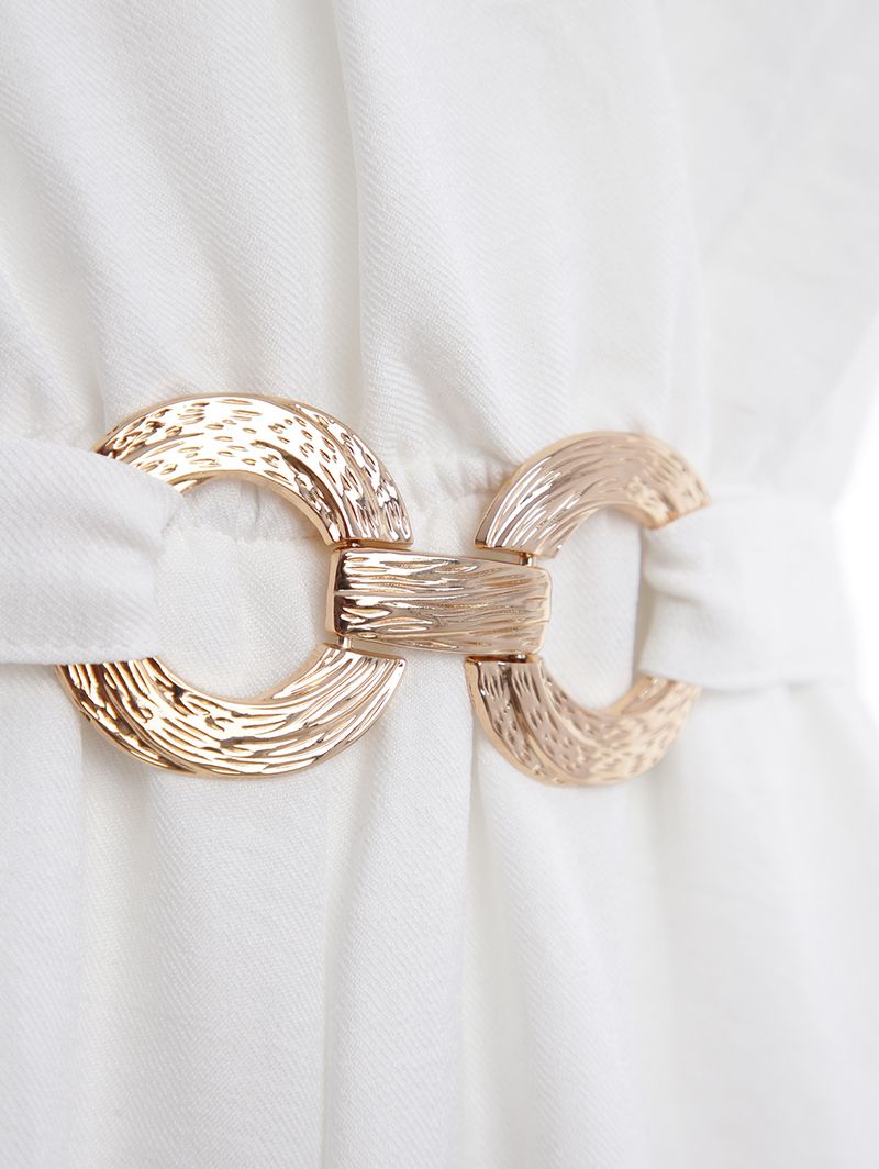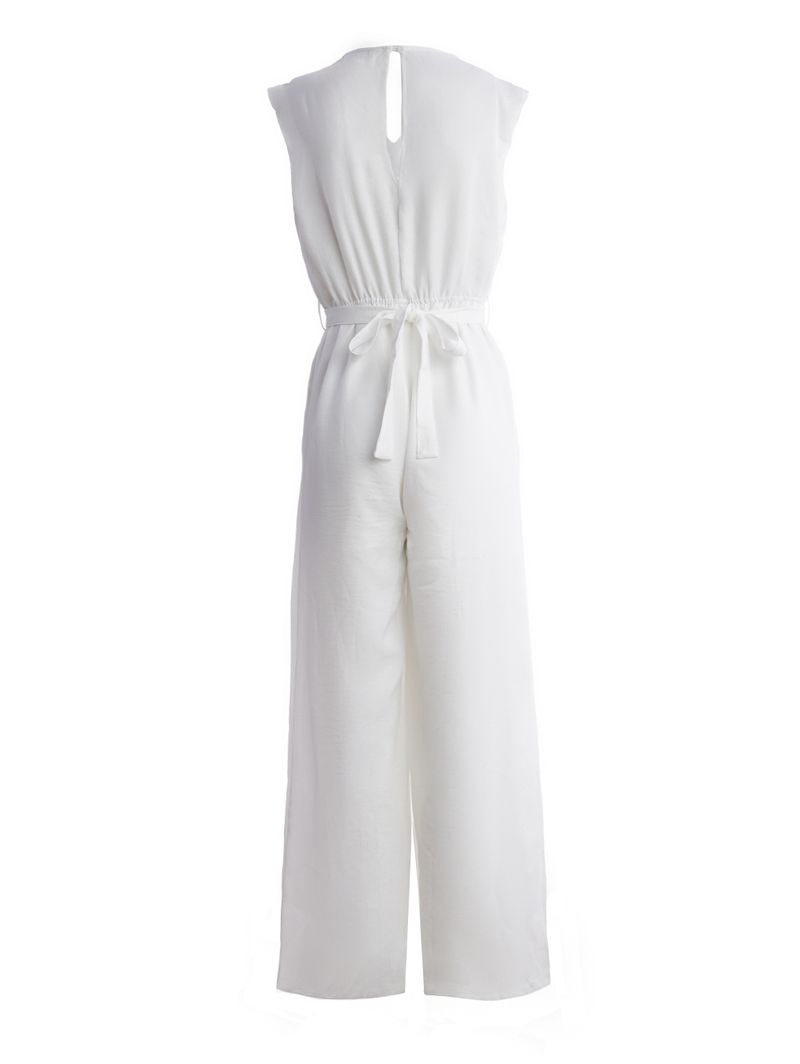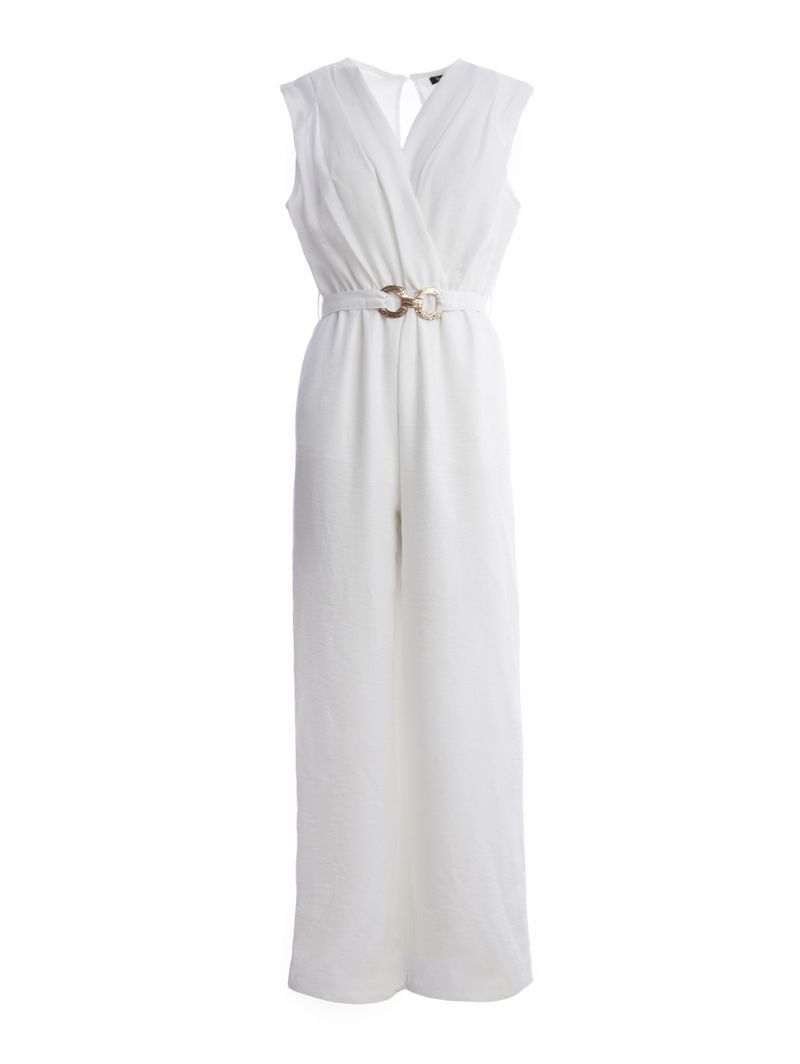 Macacão feminino desenvolvido em tecido plano de poliéster, um tecido leve e fluído, com toque macio. Apresenta modelagem pantalona com caimento amplo e confortável, decote V transpassado na parte frontal, mangas cavadas, elástico embutido na cintura e passantes para cinto. Conta com bolsos frontais funcionais. Possui também, decote vazado na parte posterior com fechamento por botão de casa. Acompanha faixa, no mesmo tecido do vestido, com aplicação metálica para amarração na cintura. Aposte nessa peça atemporal e experimente a sensação de estar sempre estilosa e pronta para qualquer situação!\n\nTecido: Plano\nComposição: 100% poliéster