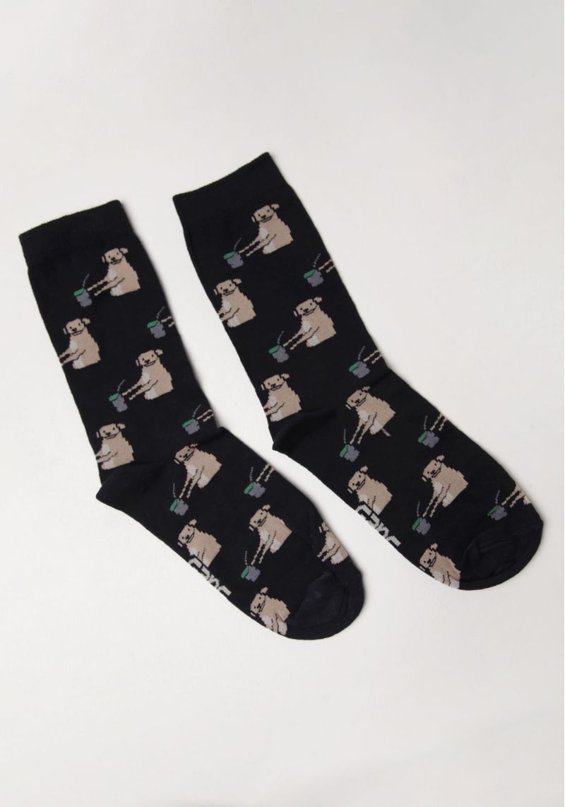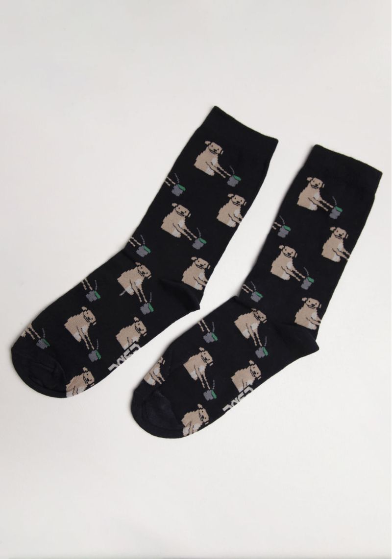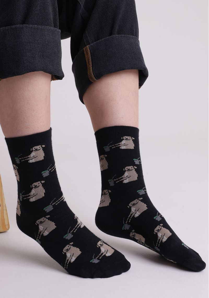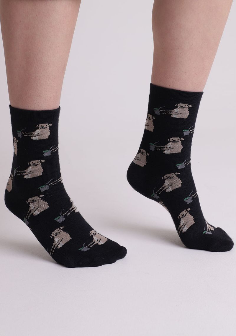 A Meia cano alto preta traz a divertida estampa de um caramelo tomando chimarrão ¿ perfeita pra quem curte um toque regional e bem-humorado no visual.