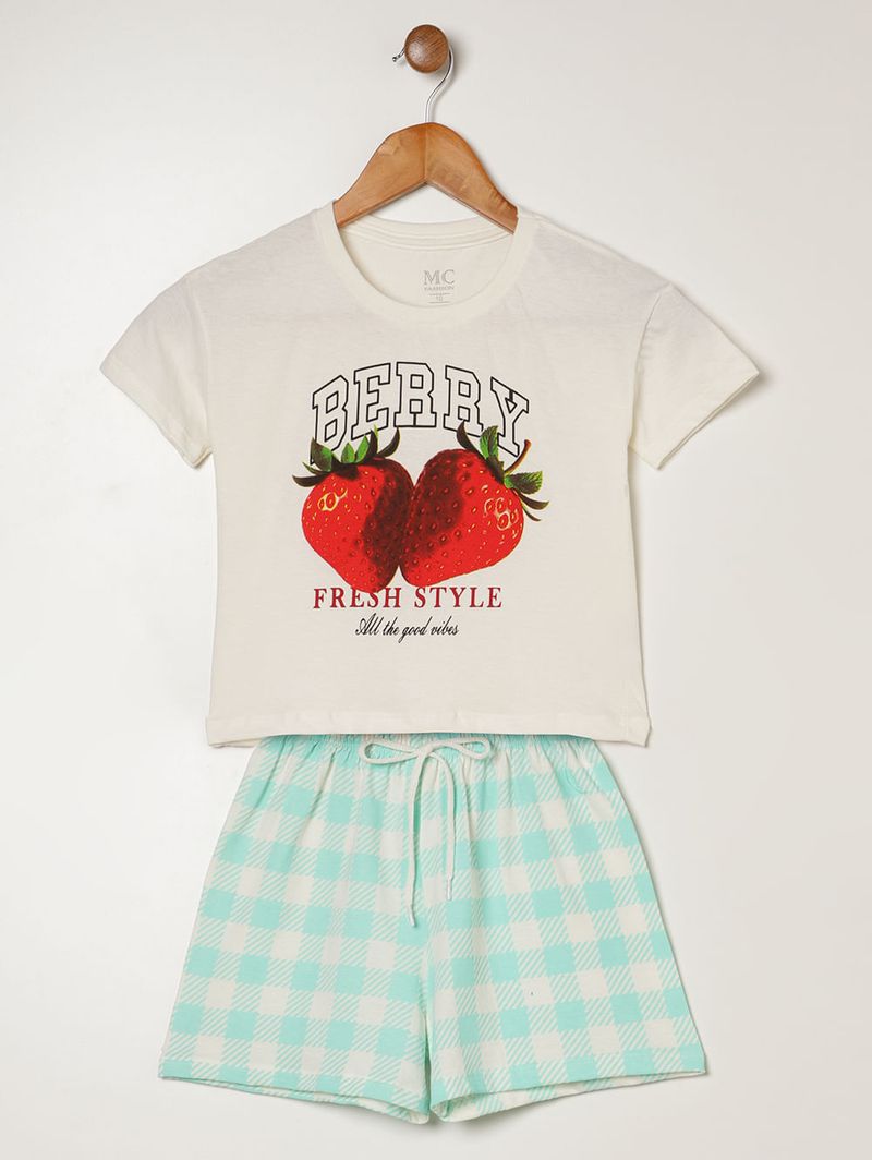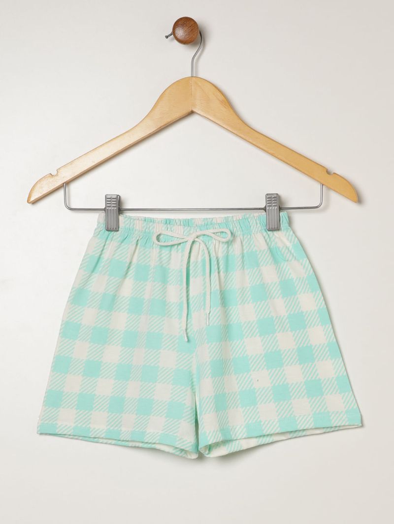 Pijama curto juvenil para menina desenvolvido em meia malha 100% algodão, oferecendo toque macio, respirabilidade e muito conforto para as noites de descanso. A blusa possui gola redonda com reforço interno, mangas curtas e barra com acabamento simples, além de estampa frontal que deixa o visual ainda mais delicado e divertido. O short conta com cós elástico e cordão decorativo, garantindo praticidade ao vestir, além de estampa xadrez em toda a extensão, trazendo charme ao conjunto. Uma escolha perfeita para garantir noites leves, confortáveis e cheias de aconchego!\n\nTecido: Meia malha\nComposição: 100% algodão