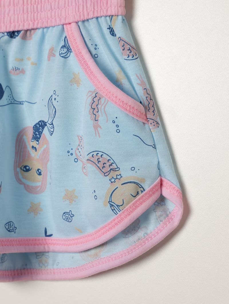 Pijama infantil para menina desenvolvido em malha leve e macia, garantindo conforto e bem-estar durante toda a noite. A blusa regata possui gola redonda, mangas cavadas e acabamentos simples, proporcionando frescor e liberdade de movimento. A bermuda conta com cós elástico, caimento confortável e bolsos frontais funcionais que deixam a peça ainda mais prática. O design lúdico ganha charme extra com a estampa de sereia em ambas as peças, trazendo magia e encanto ao visual. Um pijama pensado para tornar cada momento de descanso ainda mais especial, cheio de conforto e fantasia!\n\nTecido: Malha\nComposição: 100% poliéster