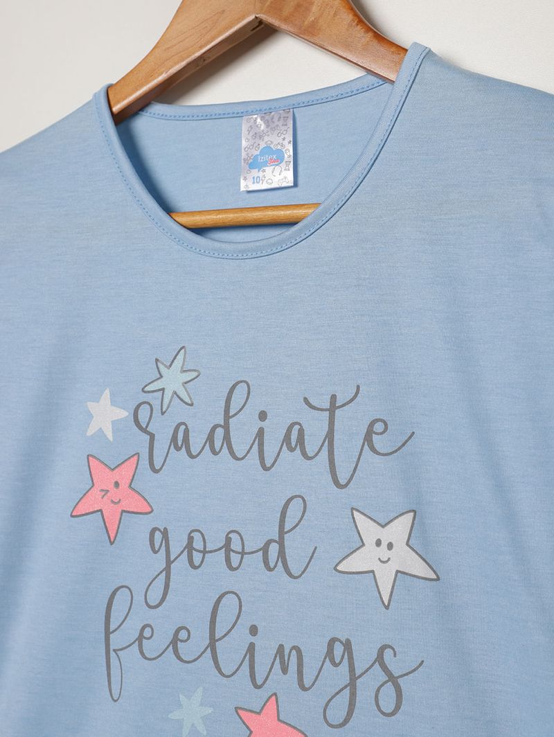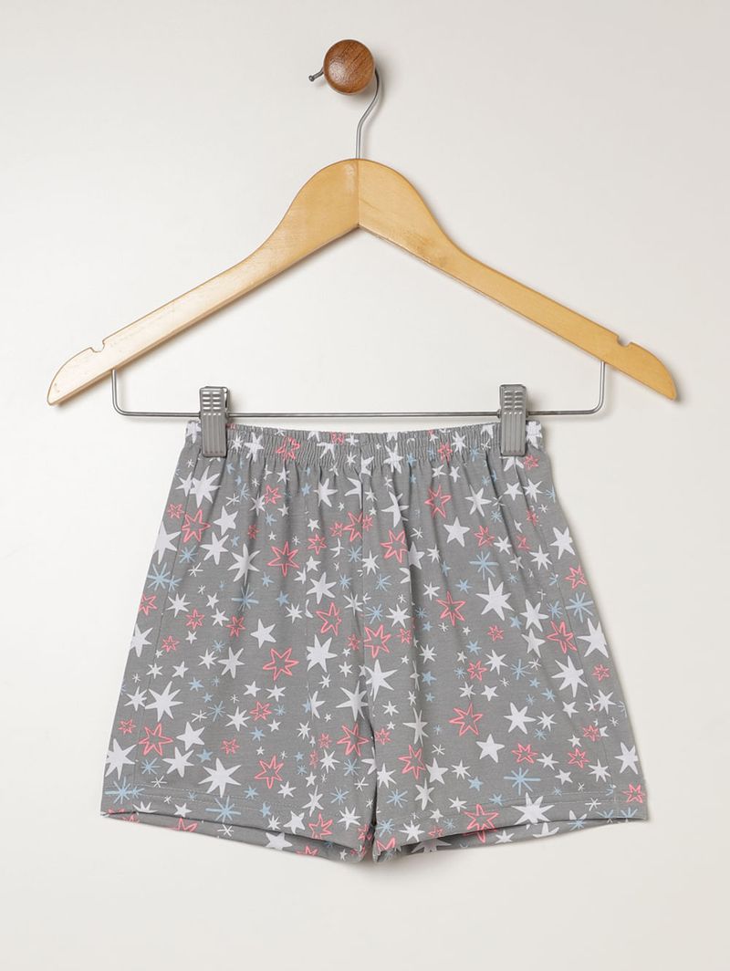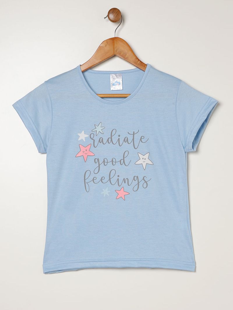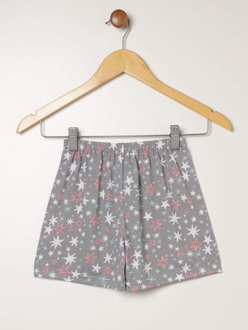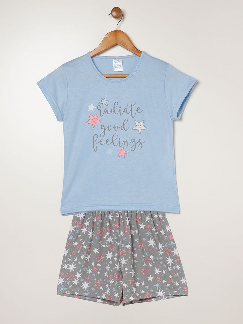 Pijama juvenil para menina composto por blusa e short, ambos desenvolvidos em malha, um tecido macio e confortável. A blusa possui gola redonda, mangas curtas, barra com acabamento simples e diferencial de estampa na parte frontal. O short possui cós elástico, barra com acabamento simples e diferencial de estampa em toda extensão da peça. Sonhos tranquilos e muito conforto, o pijama que transforma a hora de dormir em puro aconchego!\n\nTecido: Malha\nComposição: 67% poliéster, 33% viscose