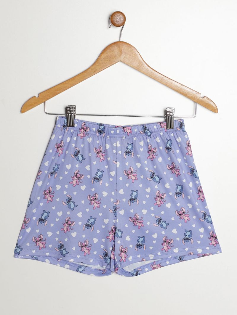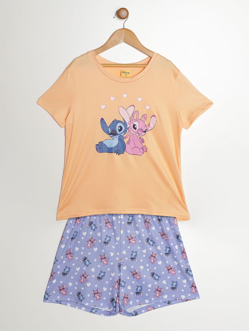 Pijama curto juvenil para menina confeccionado em tecido polybrush, que oferece toque macio, caimento leve e conforto durante o sono. A blusa possui gola redonda, mangas curtas e barra com acabamento simples, com estampa divertida do Stitch e da Angel na parte frontal. O short conta com cós elástico para melhor ajuste, barra com acabamento simples e estampa em toda a extensão dos personagens, deixando o visual ainda mais encantador e divertido!\n\nTecido: polybrush\nComposição: 95% poliéster, 5% elastano
