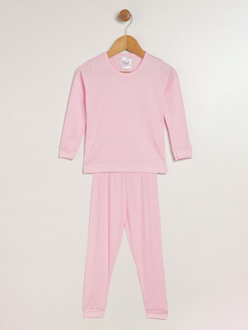 Pijama infantil para menina composto por duas peças, sendo uma blusa e uma calça, ambos desenvolvidos em malha canelada, um tecido com toque macio e com listras em relevo na posição vertical. A blusa possui gola redonda, mangas longas com punho e acabamentos simples. A calça apresenta cós elástico e barra com acabamento em punho, proporcionando um ajuste confortável. Confeccionado em tecido macio e leve, o pijama garante liberdade de movimento e bem-estar durante o uso. Invista em conforto para os momentos de descanso da sua menina!\n\nTecido: Malha Canelada\nComposição: 67% poliéster, 33% viscose