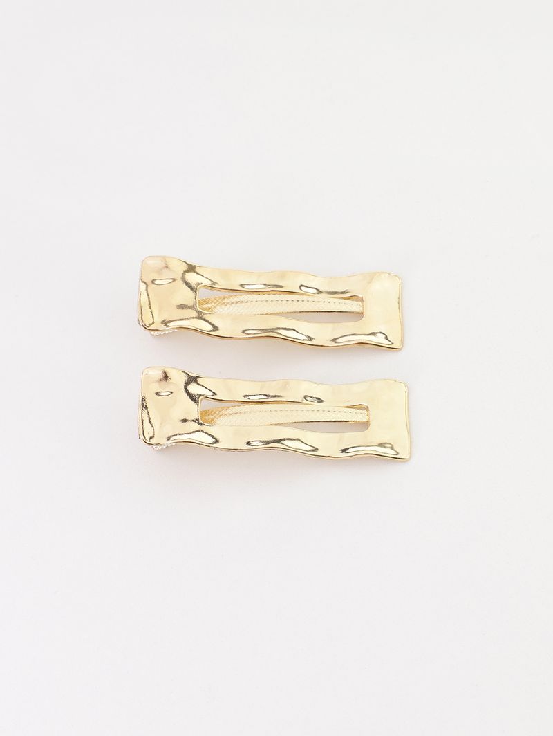 Acessório Bijuteria; Contém: 02 Presilhas de Cabelo; Formato: Retangular Orgânico; Fechamento: Bico de Pato; Cor: Dourado.