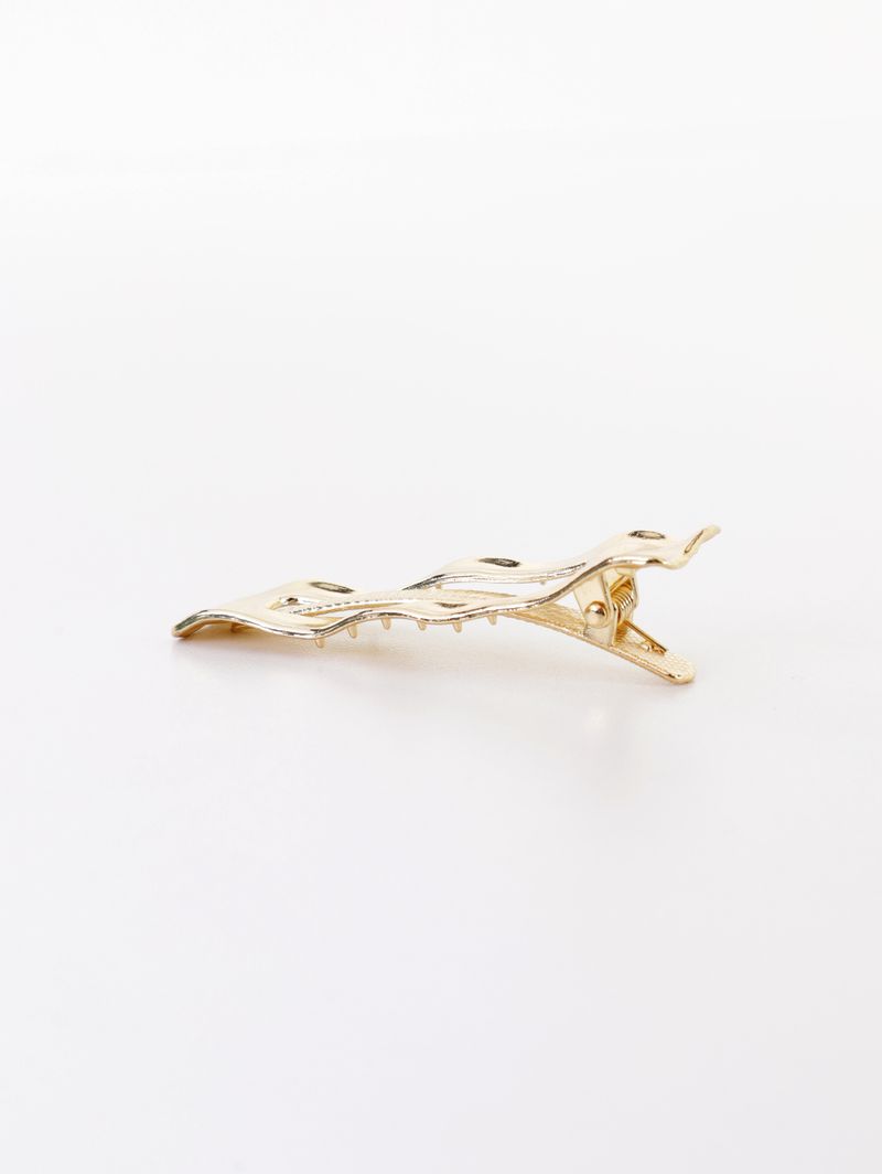 Kit composto por 02 presilhas de cabelo grandes, em formato retangular, com design orgânico. Inspiradas nas formas da natureza, elas combinam curvas suaves e um acabamento elegante, detalhes que valorizam qualquer produção. Com bicos de pato, essas presilhas oferecem uma fixação segura e fácil de usar, sendo ideais para todos os tipos de cabelo. O acessório perfeito para criar penteados modernos e elegantes em segundos!\n\nEspecificações do produto:\n\nAcessório Bijuteria;\nContém: 02 Presilhas de Cabelo;\nFormato: Retangular Orgânico;\nFechamento: Bico de Pato;\nCor: Dourado.\n\nObservação: Para uma maior conservação do acessório, evite que ele tenha contato com perfumes, cremes, maquiagem, água salgada, cloro e materiais de limpeza.