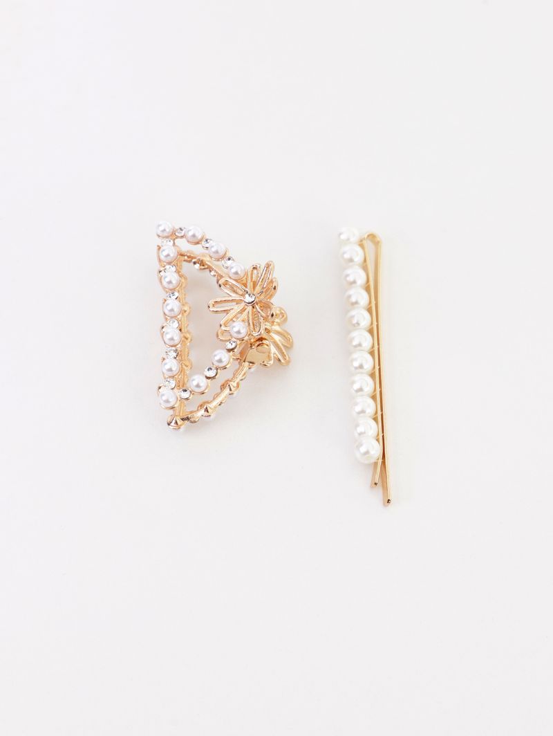 Kit composto por 02 presilhas de cabelo, uma em formato de grampo e outra com seis dentes que são perfeitos para não deixar que ela escorregue e danifique o cabelo. Ambas contam com aplicação de delicadas pérolas ao longo de sua extensão. As presilhas eram tendência nos anos 90, e agora estão de volta como um acessório chave para fazer diversos penteados diferentes e estilosos. Elas são perfeitas para ocasiões especiais ou para dar um charme extra ao visual do dia a dia, aposte!\n\nEspecificações do produto:\n\nAcessório Bijuteria;\nContém: 02 Presilhas de Cabelo;\nCor: Dourado.\n\nObservação: Para uma maior conservação do acessório, evite que ele tenha contato com perfumes, cremes, maquiagem, água salgada, cloro e materiais de limpeza.