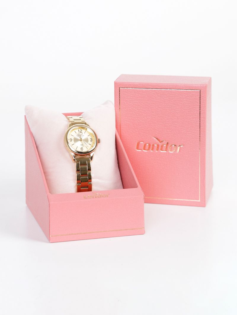 Relógio feminino desenvolvido com caixa em polímero e pulseira em aço 3 links com banho dourado. O modelo mini possui mecanismo analógico, fechamento por fivela e resistência à água em até 5 atm. Relógio feminino desenvolvido com caixa em polímero e pulseira em aço inoxidável, ambos com banho dourado. Apresenta modelo mini com caixa redonda pequena de 27mm, design delicado com mostrador dourado, pulseira fina e mecanismo analógico. Seu fechamento é feito por encaixe. Conta com resistência à água até 5 atm. Ideal para combinar com outros acessórios, o modelo mini é delicado e indispensável para facilitar o dia a dia das mulheres! Acompanha caixa e manual de instrução. Especificações do Produto: Material: Polímero/Aço Banho: Dourado Tipo: Analógico Tamanho da Caixa: 27mm Resistência à água: 5 atm Modelo: COPC21JHT/7D Linha: Mini Marca: Condor A garantia do produto deve ser acionada diretamente com o Grupo Technos. Em decorrência do uso do flash, as peças podem sofrer alteração de cor. Sobre a marca Condor: A marca faz parte do grupo Technos, a maior empresa de relógios da América Latina. Desde 1956, produz relógios com muita tradição, qualidade, tecnologia e estilo.