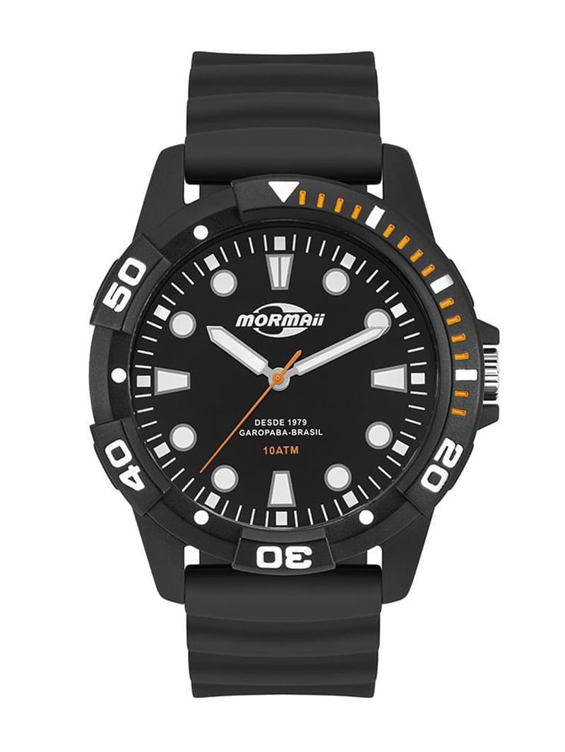 Relógio masculino desenvolvido em silicone, combinando leveza, resistência e funcionalidade para acompanhar diferentes momentos da rotina. Possui mecanismo analógico, caixa redonda de 47mm e vidro em acrílico, oferecendo praticidade no uso diário. Conta com pino para um ajuste preciso das horas. A pulseira texturizada com fechamento por fivela garante encaixe confortável e seguro ao pulso. O mostrador proporciona leitura rápida, com lúmen nos ponteiros e marcadores de hora, além de indicação de minutos no aro externo, facilitando a visualização mesmo em ambientes com pouca luz. Com resistência à água de até 100 metros, você está pronto para encarar diferentes aventuras. Um modelo da Mormaii que une desempenho e estilo, reforçando atitude e confiança em qualquer ocasião! Acompanha caixa e certificado de garantia.\n\n Especificações do Produto:\n\n Cor: Preto\n Tipo: Analógico\n Material: Silicone\n Cor do Mostrador: Preto\n Formato: Redondo\n Largura da Caixa: 47mm\n Resistência à água: 10 ATM\n\n Modelo: MOPC21JALL/8P\n\n A garantia do produto deve ser acionada diretamente com o Grupo Technos.