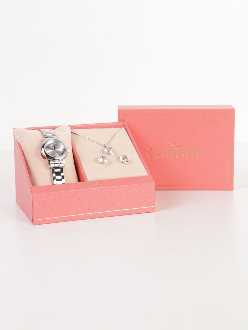 Kit feminino composto por relógio, colar e par de brincos. O relógio com modelo mini foi desenvolvido em aço inoxidável, conhecido por sua resistência à corrosão e durabilidade. O modelo mini apresenta design moderno com pontinhos e strass nos lugares dos números. Possui mecanismo analógico que contém ponteiros indicando as horas, minutos e segundos. Sua caixa redonda de 26mm foi desenvolvida em metal com vidro em cristal mineral e pino para um ajuste perfeito das horas. Apresenta fechamento por fecho dobrável, com botões em ambos os lados que facilitam ao colocá-lo. Conta com resistência à água em até 50 metros (5 ATM), para contatos acidentais com a água. Acompanha colar e par de brincos, ambos super delicados. O kit que vai realçar suas produções! Acompanha caixa e manual de instrução.\n\nEspecificações do Produto:\n\nCor: Prata\nTipo: Analógico\nMaterial: Aço inoxidável\nCor do Mostrador: Prata\nFormato: Redondo\nModelo: Mini\nLargura da Caixa: 26mm\nResistência à água: 5 ATM\n\nModelo: CO2035NMTK4K\n\nA garantia do produto deve ser acionada diretamente com o Grupo Technos.