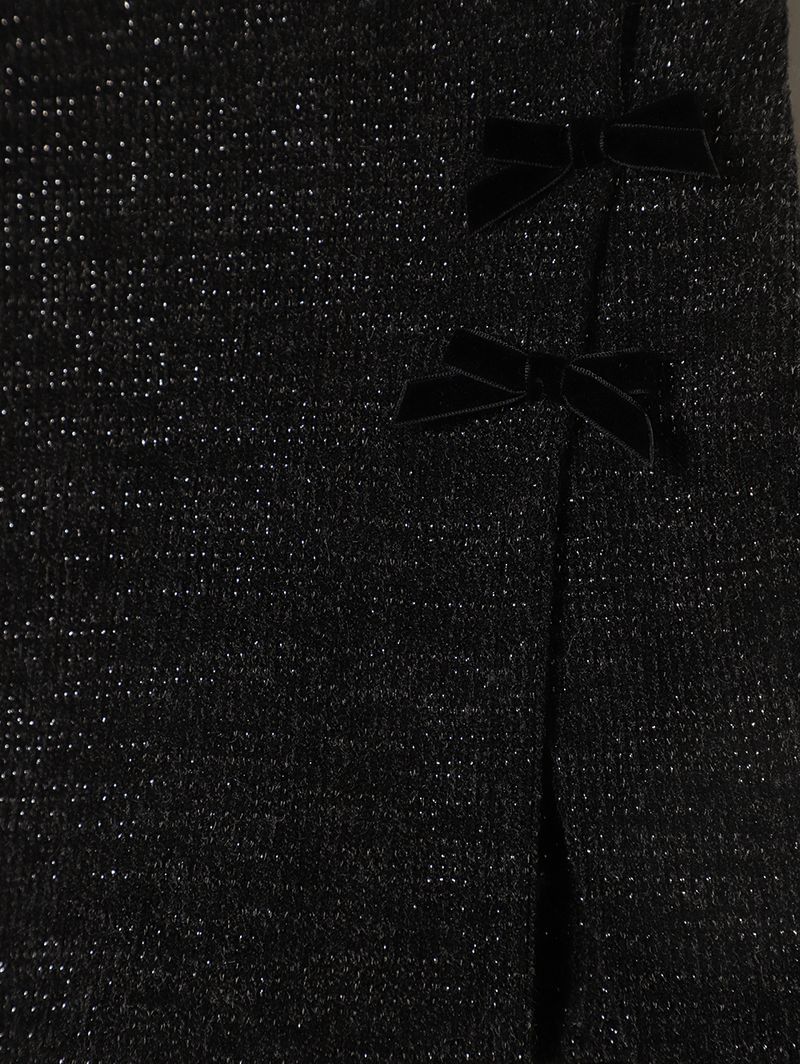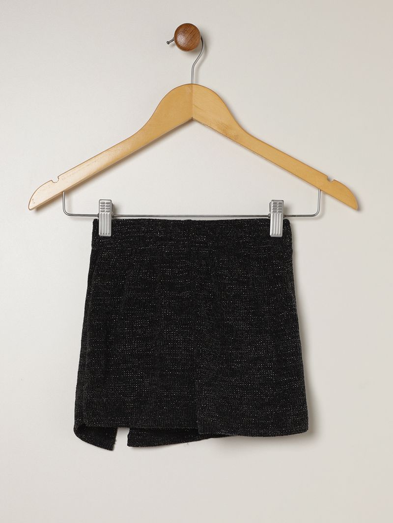 Short saia infantil para menina desenvolvido em tricot de pontos canelados, um tecido macio e encorpado, que garante conforto, aconchego e um caimento impecável. O modelo apresenta cós elástico, acabamentos simples e sobreposição fixa que garante o efeito de saia com diferencial de fenda frontal. Seu design é moderno, com fios de lurex ao longo de toda a peça, que adicionam um brilho sutil, e delicados lacinhos decorativos em veludo, conferindo um toque romântico e sofisticado à composição. Esse short saia infantil é perfeito para deixar as pequenas livres para brincar com muito estilo e delicadeza!\n\nMaterial: Tricot\nComposição: 89% poliéster, 07% viscose, 04% elastano