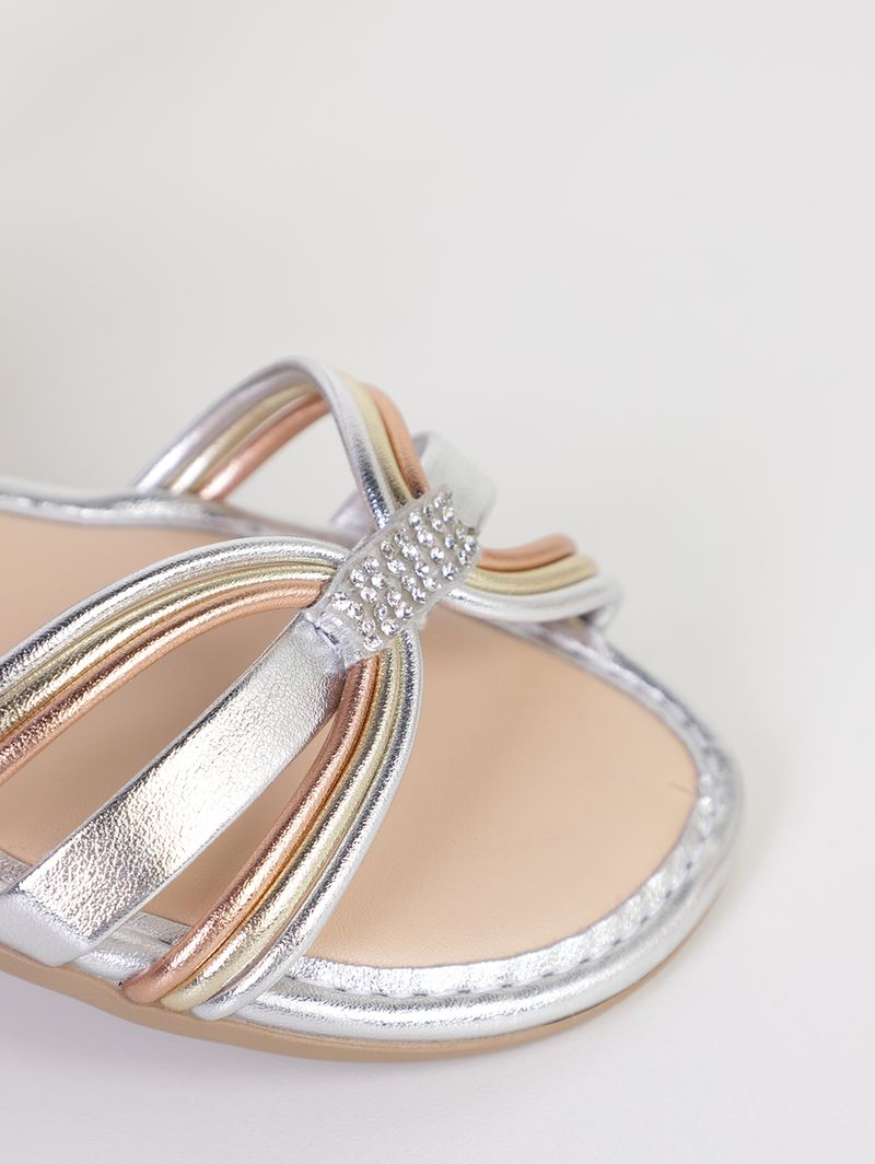 Sandália juvenil para menina desenvolvida em material sintético de boa qualidade e durabilidade. O modelo apresenta bico arredondado, multi tiras no cabedal interligadas, fechamento no tornozelo por fivela, palmilha macia e solado com frisos antiderrapantes. O seu diferencial fica por conta da aplicação de pedrarias nas tiras e na entressola que acrescentam um brilho sutil ao modelo. Delicada e cheia de estilo, essa sandália juvenil é perfeita para as meninas brilharem com conforto e charme em qualquer ocasião!\n\nMaterial: Sintético