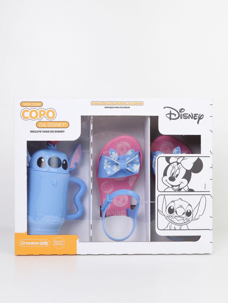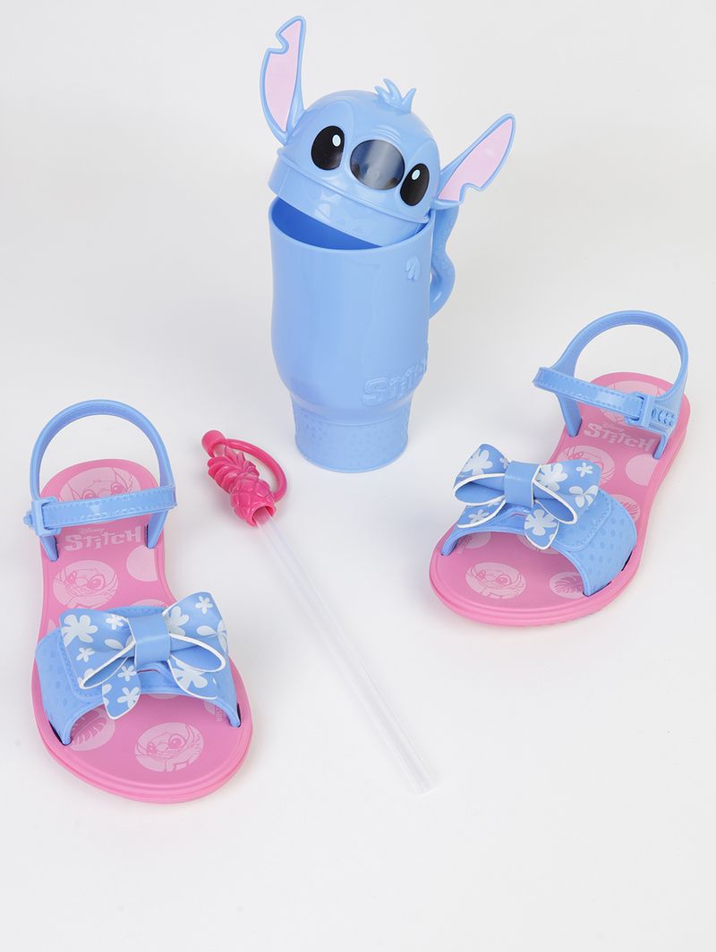 Sandália infantil desenvolvida em material sintético leve e resistente, ideal para acompanhar a rotina dos pequenos com muito conforto. Possui tira larga na parte frontal e fechamento por encaixe no tornozelo, garantindo ajuste seguro e prático. Apresenta palmilha macia e solado com frisos antiderrapantes, oferecendo estabilidade a cada passo. O modelo conta ainda com aplicação de laço na tira e estampa do personagem Stitch na palmilha, deixando o visual ainda mais divertido. O grande diferencial é que acompanha uma caixa para colorir e um copo temático do Stitch, tornando o momento de uso ainda mais especial. Perfeito para proporcionar conforto e muita diversão no dia a dia!\n\nTecido: Sintético