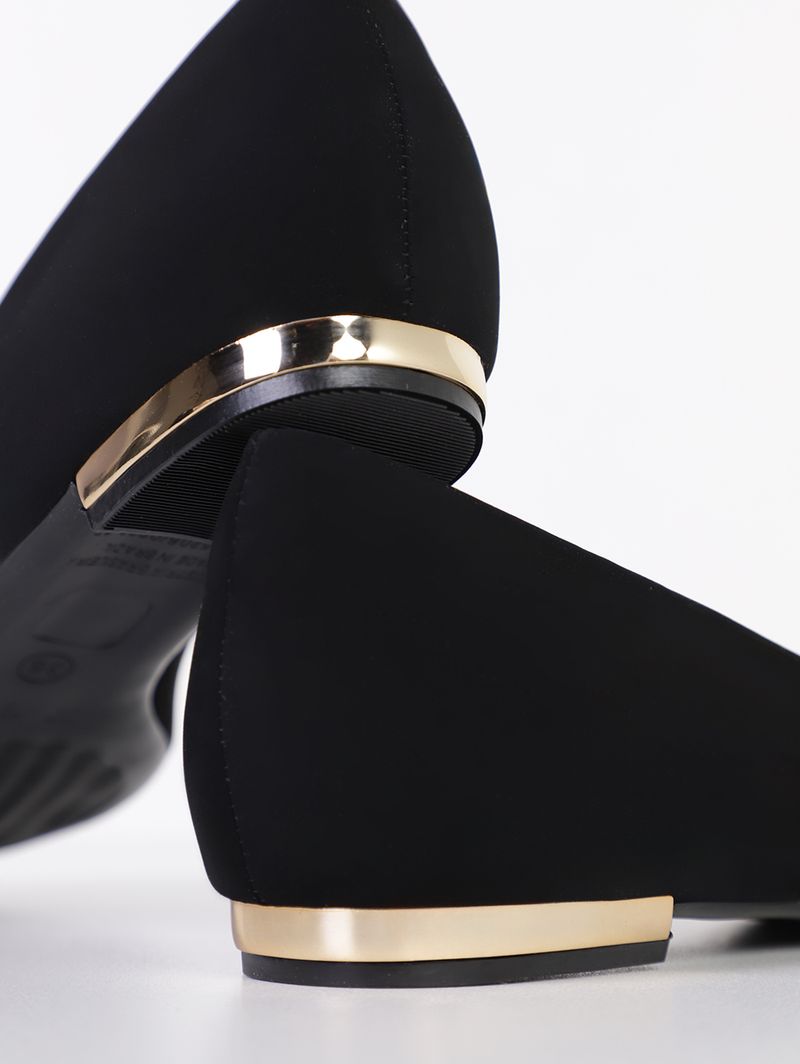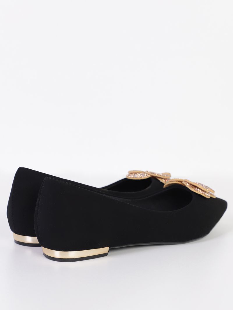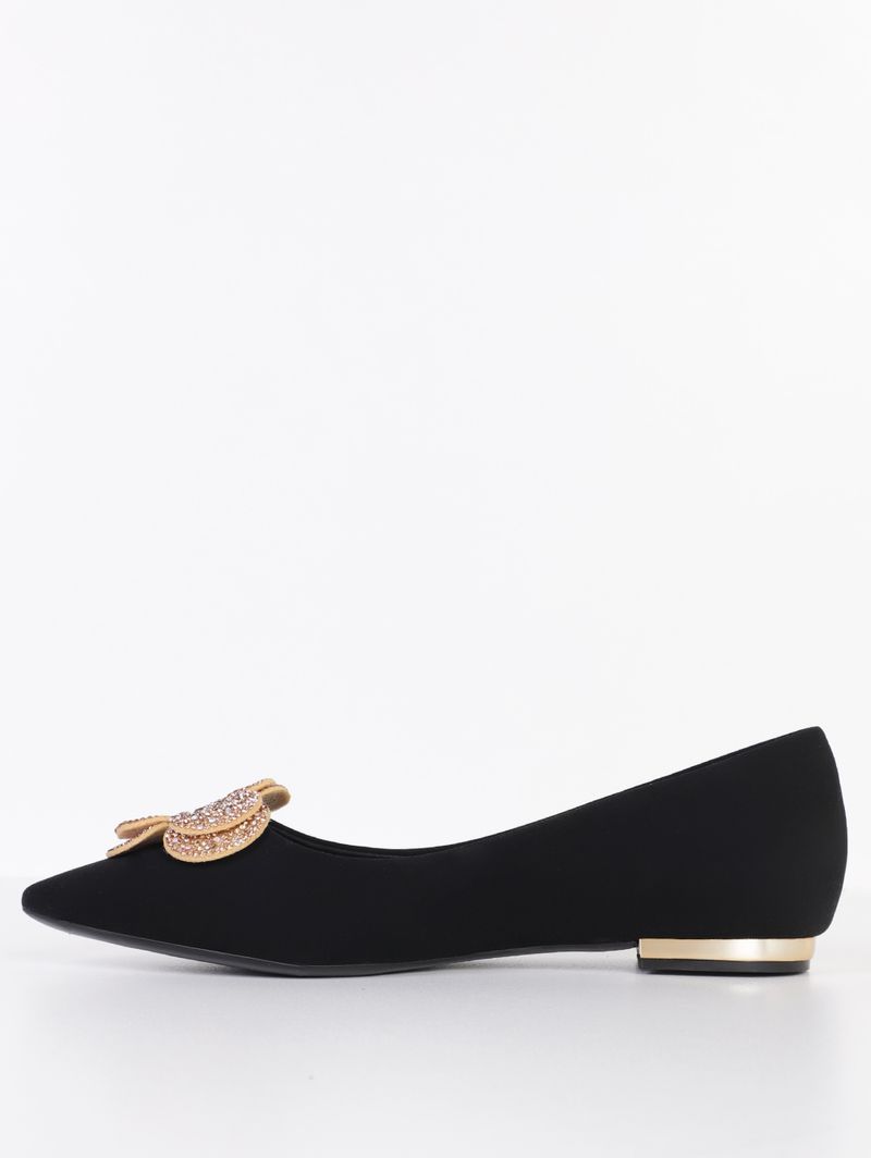 Sapatilha feminina desenvolvida em material sintético de boa qualidade e durabilidade. O modelo possui bico fino, forro interno, palmilha macia que garante o conforto do seu pé, salto de 01 cm que traz elegância, mas sem abrir mão do seu bem estar, além de solado com frisos antiderrapantes. O seu diferencial fica por conta do detalhe metalizado no salto e da aplicação de detalhe que remete à uma flor com strass que garante elegância. O calçado perfeito para você estar bem vestida em seus compromissos equilibrando entre a moda e a comodidade!\n\nMaterial: Sintético