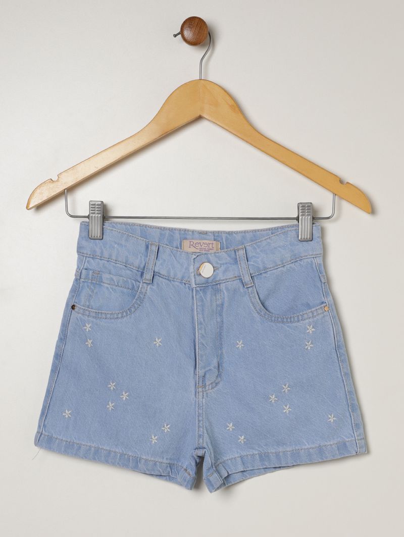 Short juvenil para menina desenvolvido em jeans 100% algodão, tecido conhecido por sua durabilidade, toque macio e caimento estruturado, que proporciona conforto e liberdade de movimento. Possui cós com passantes para cinto, ajuste interno por elástico, fechamento frontal por botão e zíper e barra com acabamento simples. O grande diferencial está nos bordados na parte frontal, que adicionam um toque delicado e cheio de charme ao visual. Um short versátil e moderno, perfeito para compor looks casuais e estilosos no dia a dia!\n\nTecido: Jeans\nComposição:100% algodão