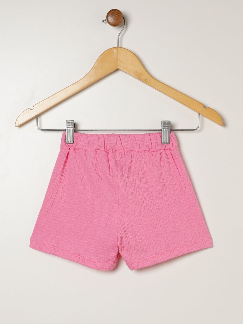 Short infantil para menina desenvolvido em anarruga , um tecido de toque macio com textura enrugada pela sua extensão, que valoriza o seu design. O modelo apresenta cós elástico com laço decorativo na parte frontal e acabamentos simples. Perfeito para deixar o look das pequenas ainda mais fofo!