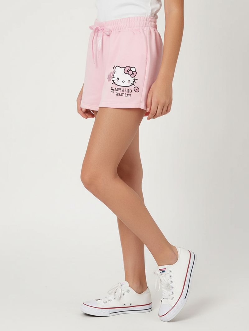 Short juvenil para menina desenvolvido em moletinho, tecido leve e macio que proporciona toque suave e liberdade de movimento. Possui cós elástico com cordão decorativo, barra com acabamento simples e bolso posterior funcional, garantindo praticidade e ótimo caimento. O destaque fica por conta da estampa da Hello Kitty na parte frontal e no bolso, que traz um toque divertido e cheio de estilo ao visual. Um short encantador e confortável, perfeito para o dia a dia!\n\nTecido: Moletinho\nComposição: 50% algodão, 50% poliéster
