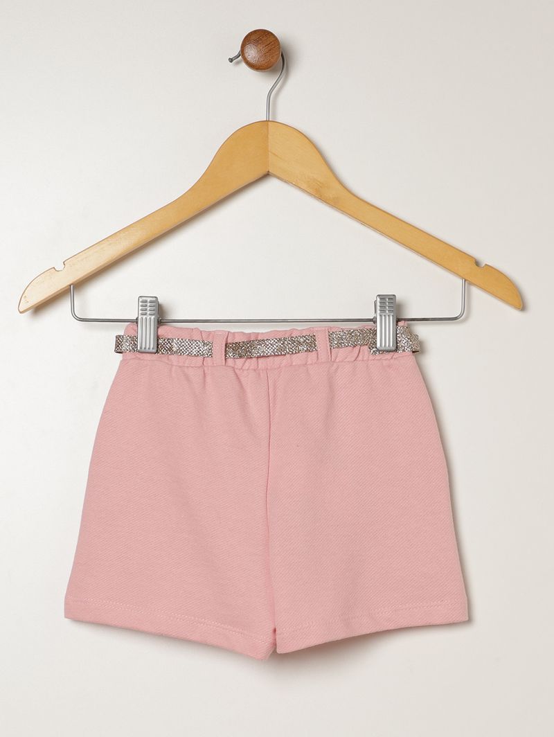 Short infantil para menina desenvolvido em moletinho texturizado 100% algodão, que garante toque macio, conforto e liberdade de movimentos. Possui cós elástico para melhor ajuste, passantes para cinto e bolsos frontais funcionais que trazem praticidade ao dia a dia. Acompanha cinto em material sintético com fivela quadrada e aplicação de glitter pela sua extensão. Com acabamentos simples e design moderno, é uma peça leve e versátil que une conforto e estilo, acompanhando as pequenas em todas as brincadeiras com muito charme e liberdade!\n\nTecido: Moletinho Texturizado\nComposição: 100% algodão