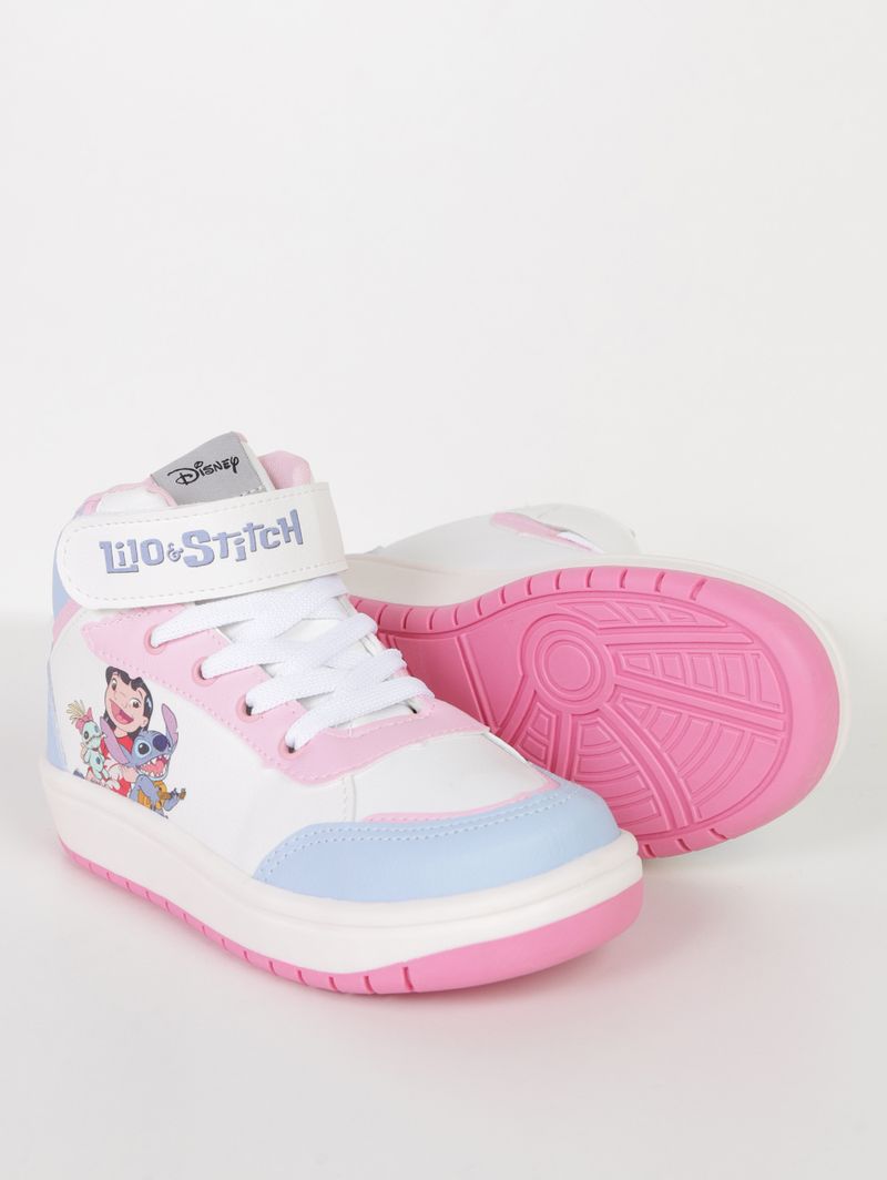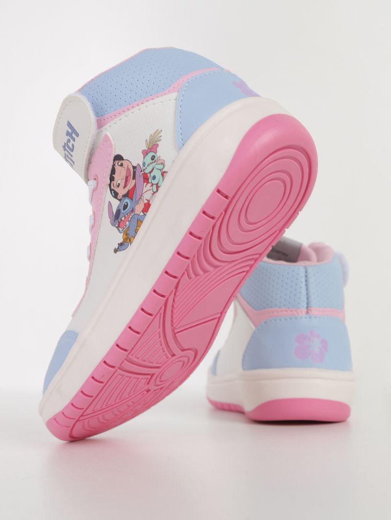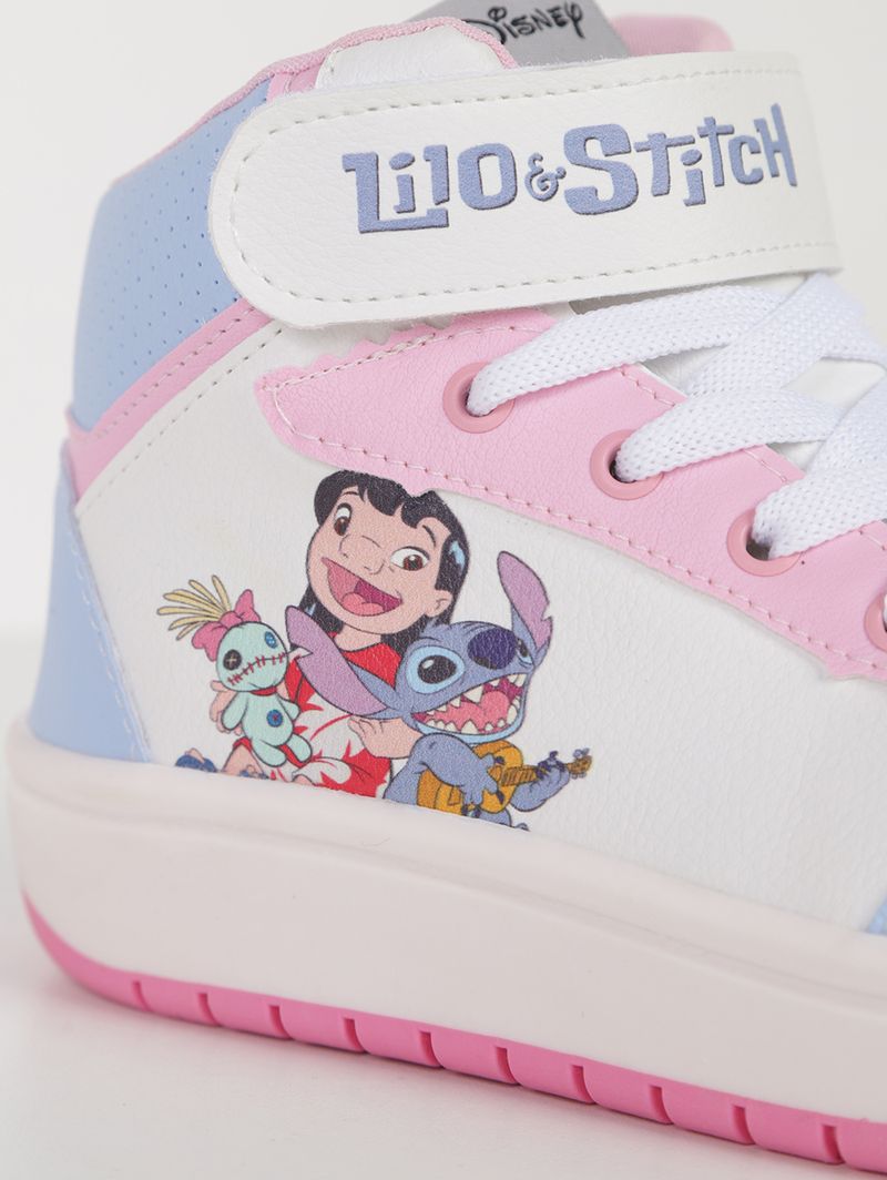 Tênis infantil para menina desenvolvido em material sintético, garantindo resistência e praticidade para acompanhar cada momento do dia. Possui forro macio espumado, bico redondo, ajuste por cadarço e velcro, além de palmilha macia que proporciona conforto e encaixe seguro. O solado emborrachado oferece estabilidade e aderência ao caminhar. O diferencial fica por conta do cano alto e da estampa de Lilo e Stitch no cabedal, trazendo um visual moderno, divertido e cheio de personalidade. Um modelo encantador que deixa os passos ainda mais alegres e cheios de estilo!\n\n Material: Sintético\n Material Solado: Borracha