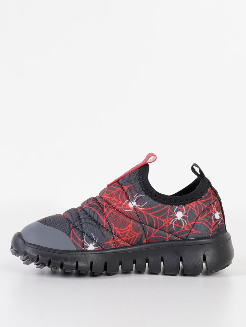 Tênis infantil para bebê menino desenvolvido em material têxtil maleável de boa qualidade que garante conforto para os pés dos pequenos. O modelo slip on apresenta design divertido com estampa de aranhas pelo cabedal. Possui calce fácil com tira frontal e posterior, bico redondo e palmilha almofadada. Conta com solado emborrachado que garante maior aderência ao solo. Fácil de calçar, super leve e cheio de estilo, ele transforma qualquer look em uma verdadeira aventura!\n\nMaterial: Têxtil\nMaterial Solado: Borracha