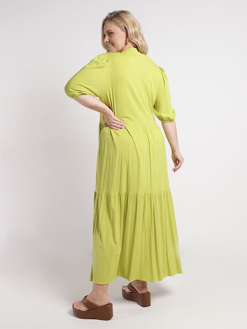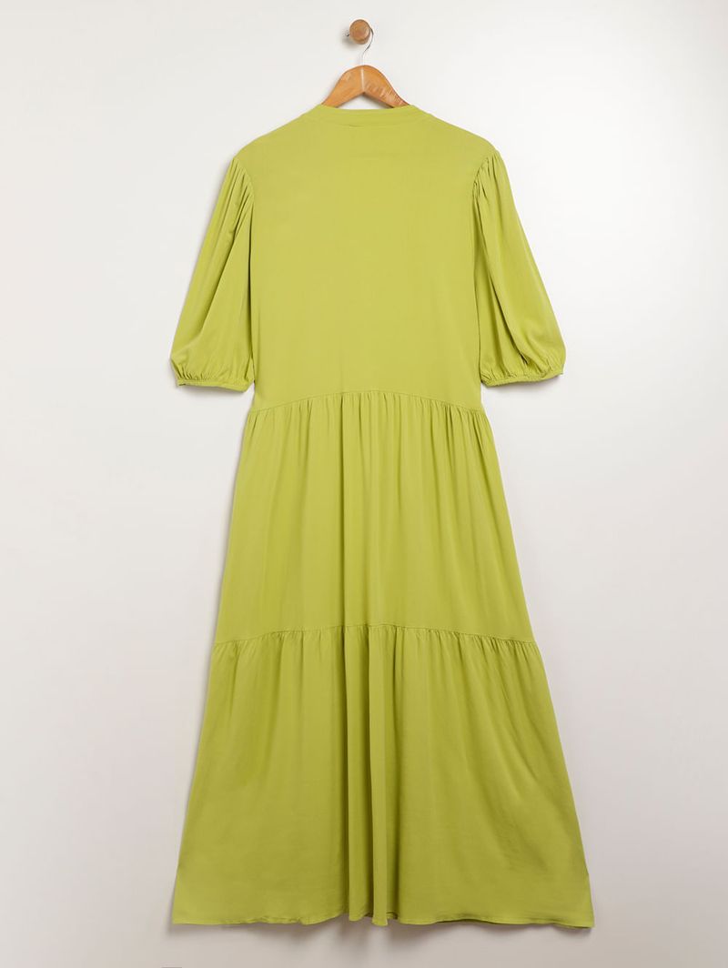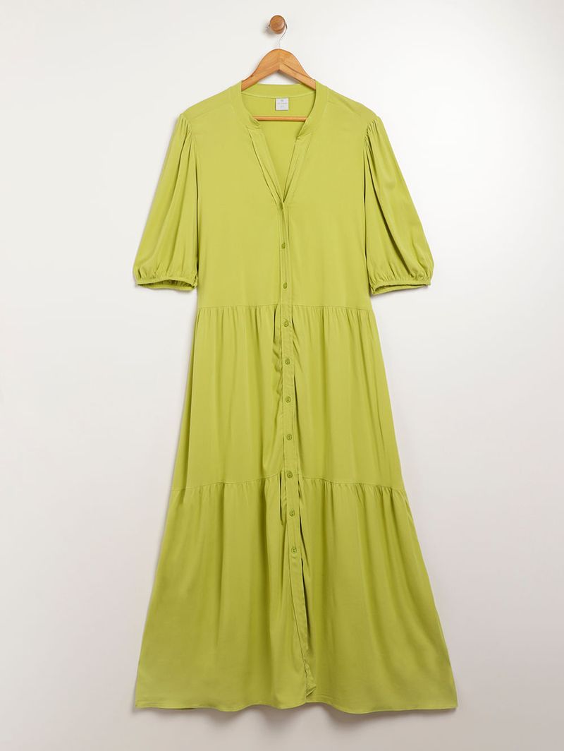 Vestido feminino desenvolvido em tecido plano de viscose, uma fibra de origem natural que é sinônimo de leveza, conforto e sofisticação, ela proporciona uma sensação agradável na pele. O modelo chemise apresenta comprimento midi com caimento fluído ao corpo, ainda conta com fechamento frontal por botões de casa, decote V, mangas curtas bufantes que agregam delicadeza à peça e acabamentos em babados a partir da cintura. Seja qual for a ocasião, este vestido será o seu novo curinga no guarda-roupa!\n\nTecido: Plano\nComposição: 100% viscose