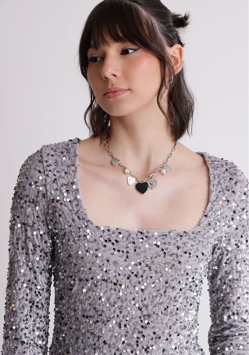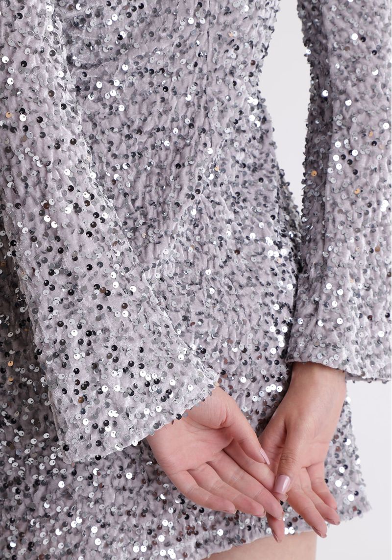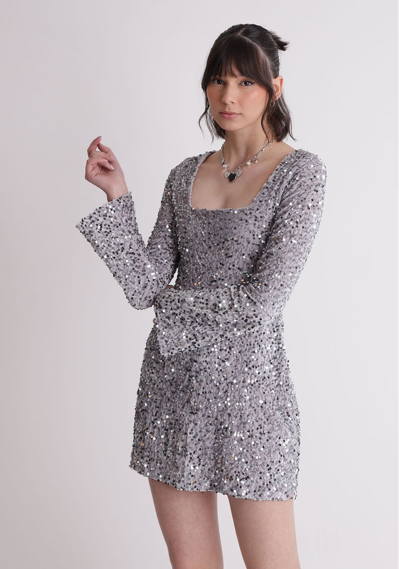 Vestido de paetê, confeccionado em paetê prata, com fundo de veludo molhado, com modelagem ajustada ao corpo e mangas sino. Possui forro em todo o corpo.
