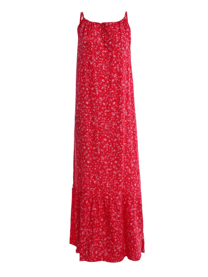 Vestido feminino desenvolvido em tecido plano, um tecido leve e fluido, ideal para dias quentes. O modelo apresenta alças finas, elástico na parte posterior e cordão decorativo na parte frontal. Possui comprimento longo, aplicação de babado na parte inferior e barra com acabamento simples. O seu diferencial fica por conta da estampa floral em toda a extensão da peça que a deixa mais delicada. O vestido perfeito para todas as ocasiões com estilo e sofisticação!\n\nTecido: Plano\nComprimento: Longo\nComposição: 100% viscose