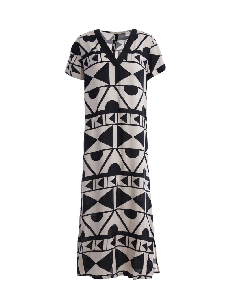 Vestido feminino desenvolvido em tecido plano, com viscose em sua composição, um tecido leve e respirável, ideal para os dias quentes da estação. O modelo com caimento fluido junto ao corpo, conta com um design de estampas geométricas que se destacam pela combinação diferenciada de formas e padrões, o comprimento midi traz elegância e versatilidade à peça. Além de, mangas curtas com detalhe dobrado, gola V, fenda nas laterais que permitem melhor movimentação. O acabamento é simples na barra. Perfeito para quem busca um estilo moderno e ousado, sem abrir mão do conforto!\n\nTecido: Plano\nComposição: 100% viscose