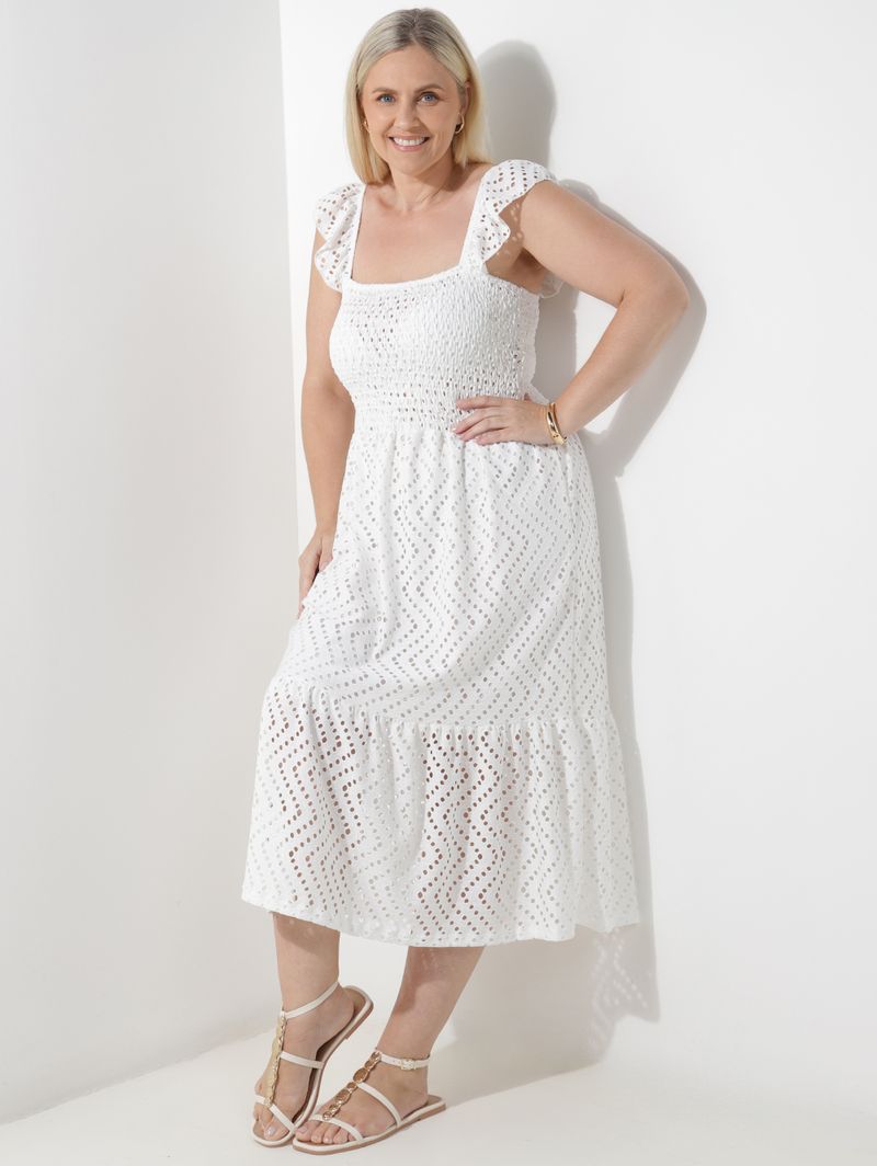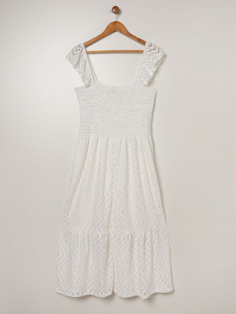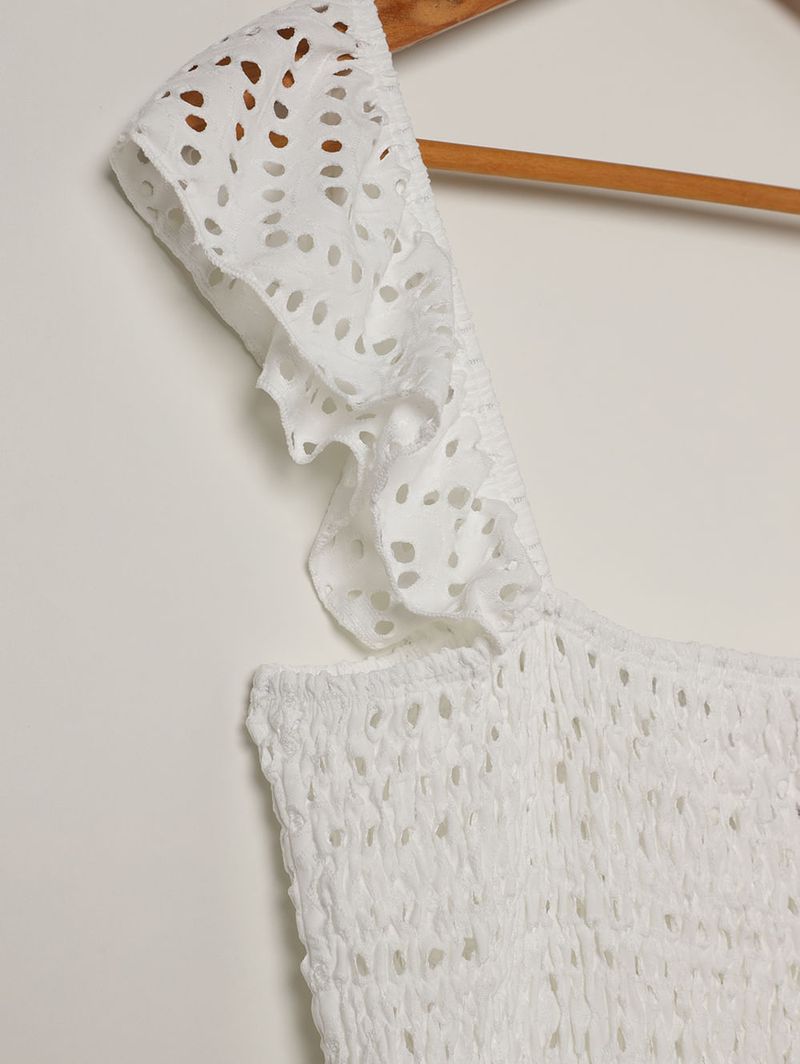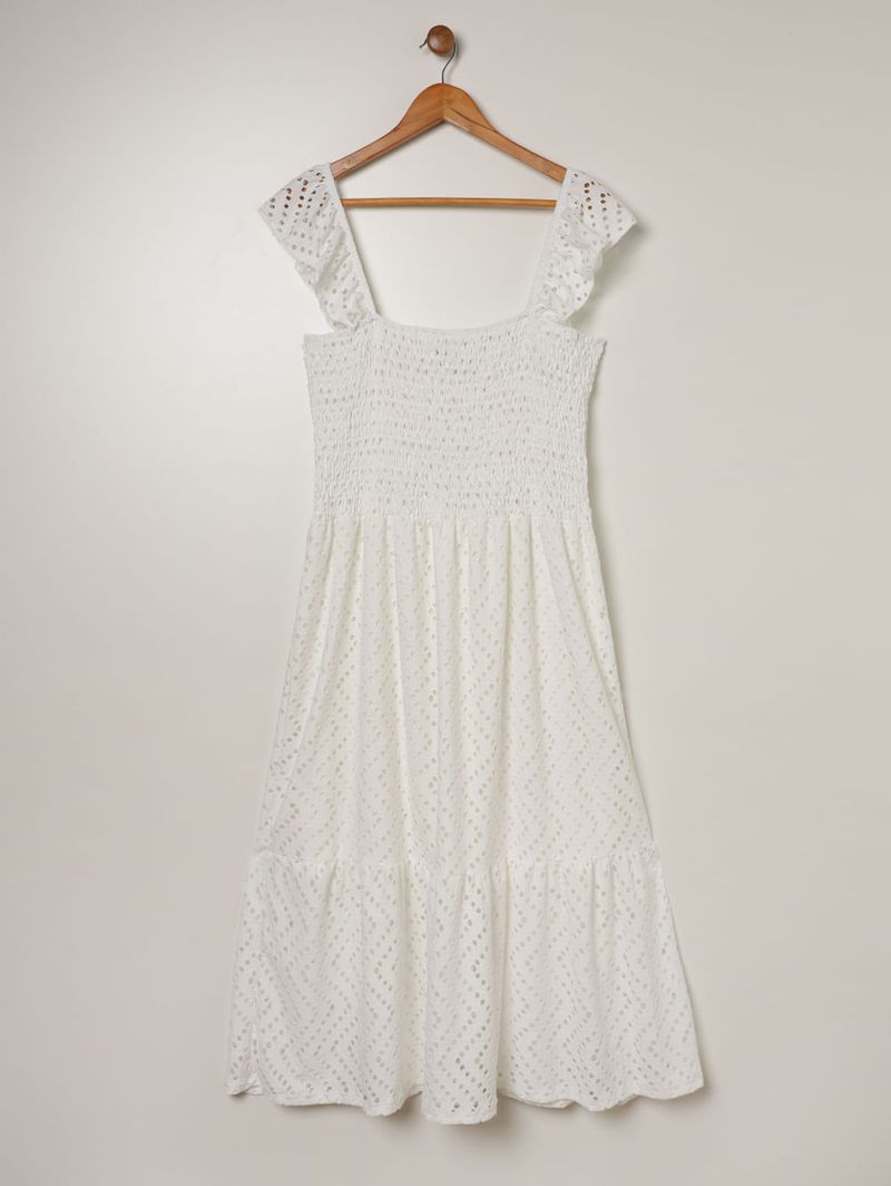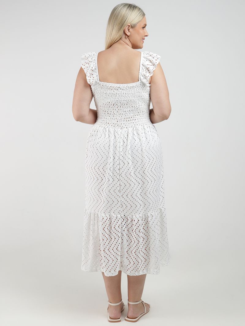 Vestido feminino desenvolvido em malha broderi , um tecido confortável com pequenos recortes a laser que agregam sofisticação e delicadeza à qualquer peça. O modelo possui forro leve em tecido de poliéster, ideal para evitar a transparência. Apresenta aplicação de lastex no busto para um ajuste perfeito, decote quadrado e alças com elástico embutido e babados delicados. Conta com comprimento midi que moderniza ainda mais o vestido. A escolha perfeita para complementar as produções do verão! Combine com Sandálias .