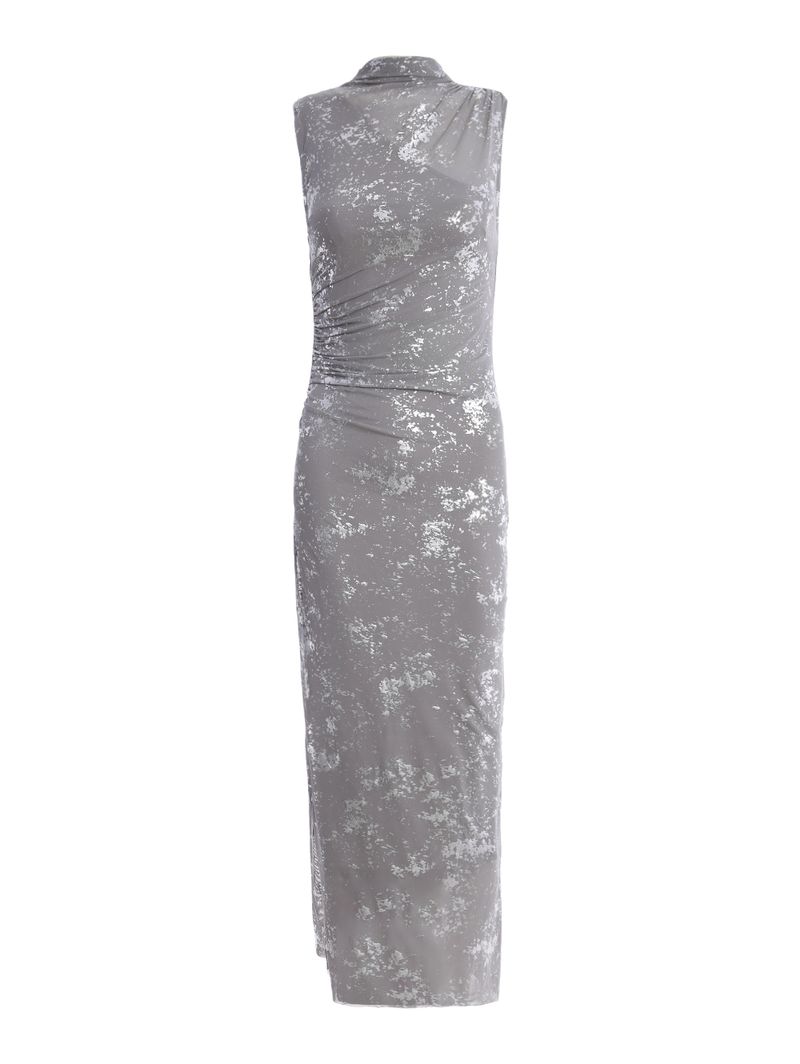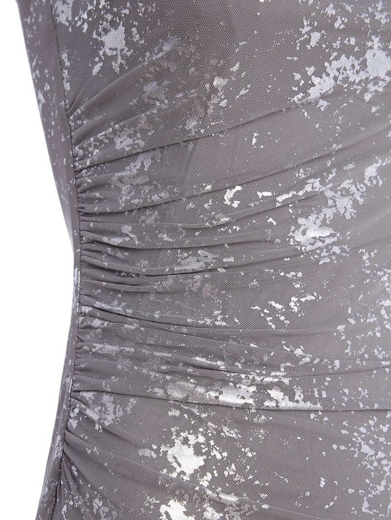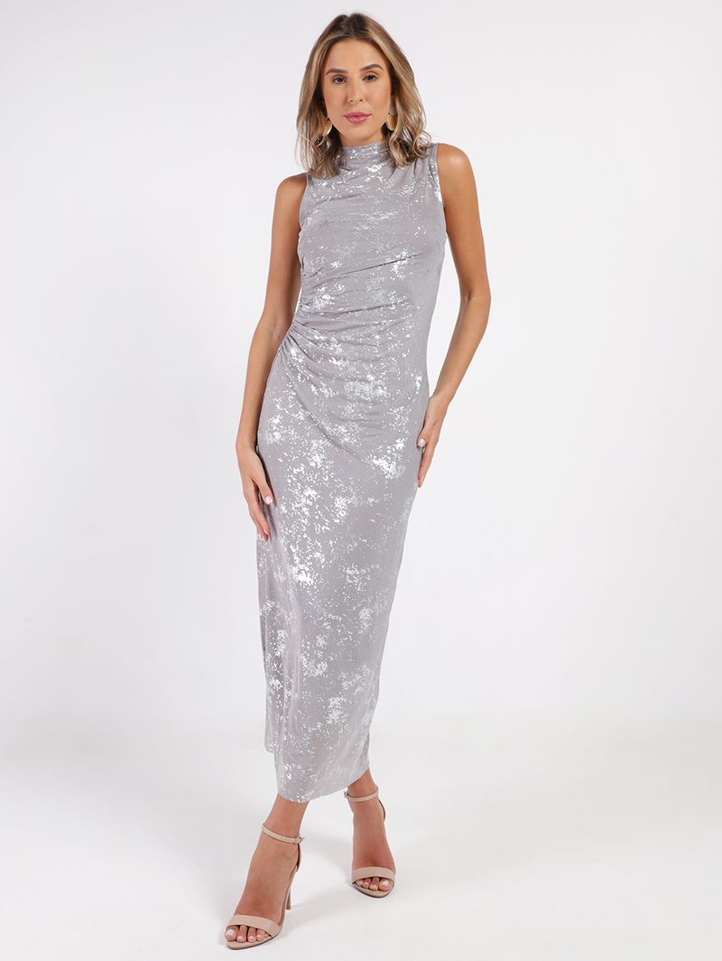 Vestido feminino desenvolvido em tule, um tecido leve que confere uma textura delicada à peça. Conta com forro em malha de poliéster que evita transparência e possui decote um ombro só e acabamentos simples. O modelo apresenta comprimento longo, gola alta, mangas cavadas e acabamentos a fio. Como destaque, esta peça possui detalhe de foil por toda sua extensão, trazendo um acabamento metalizado com efeito falhado que adiciona um brilho discreto e super moderno. O drapeado delicado em uma das laterais complementa o design, unindo elegância e sofisticação, enquanto valoriza a silhueta com um toque de charme e exclusividade. O vestido ideal para quem busca uma produção com estilo e personalidade!\n\nTecido: Tule\nComprimento: Longo\nComposição: 100% poliéster