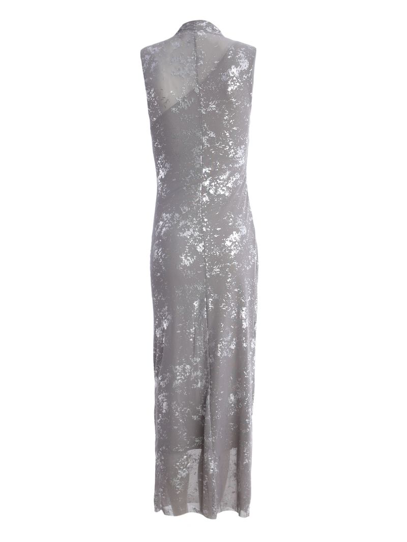 Vestido feminino desenvolvido em tule , um tecido leve que confere uma textura delicada à peça. Conta com forro em malha de poliéster que evita transparência e possui decote um ombro só e acabamentos simples. O modelo apresenta comprimento longo , gola alta, mangas cavadas e acabamentos a fio. Como destaque, esta peça possui detalhe de foil por toda sua extensão, trazendo um acabamento metalizado com efeito falhado que adiciona um brilho discreto e super moderno. O drapeado delicado em uma das laterais complementa o design, unindo elegância e sofisticação, enquanto valoriza a silhueta com um toque de charme e exclusividade. O vestido ideal para quem busca uma produção com estilo e personalidade!